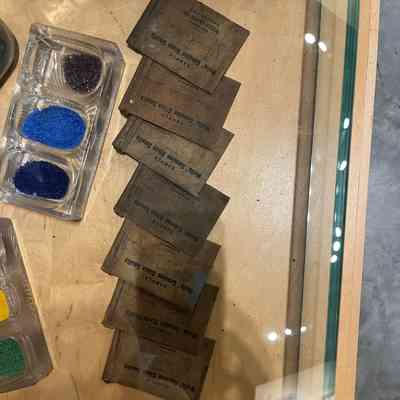 Seven sample packets of "Wells Genuine Glass Smalts," including: #64 green - medium,#82 blue - medium, dark mixed - medium, black - medium, yellow - medium, Prussian - blue medium and wine purple - coarse.