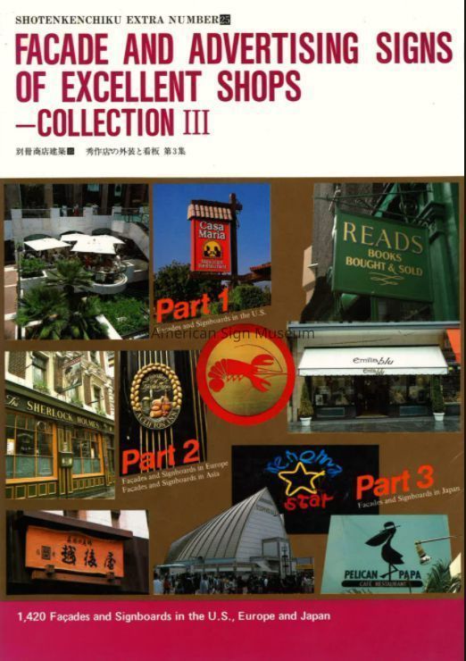 Facade and Advertising Signs of Excellent Shops - Collection III Published by Shotenkenchiku-Sha, Co., Ltd., Tokyo, Japan: 1985. Please note this text is written in both Japanese and English. Softbound; Color and B&W illustrations; 272 pages"1,420 Facades and Signboards in the U.S., Europe, and Japan."Collection