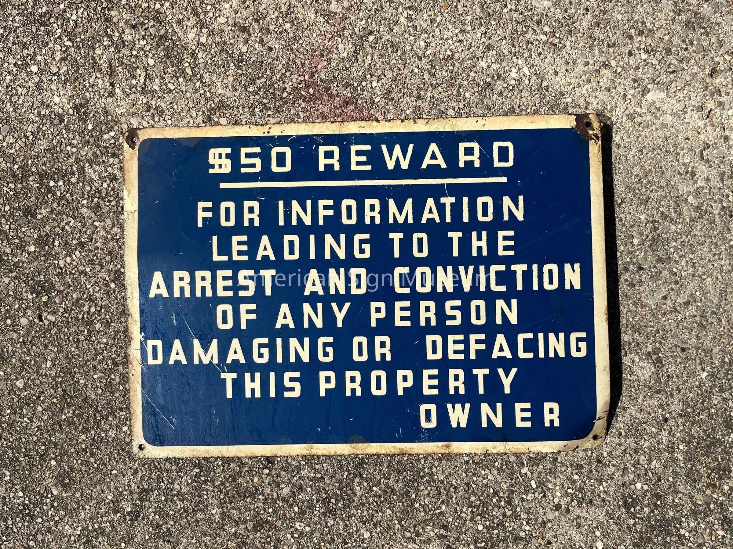 Metal reward sign attached to the Fairmount Methodist Church Plastic Sign (2025.0038.0001). The Sign Reads "$50 Reward For information leading tot he arrest and conviction of any person damaging or defacing this property owner"Collection