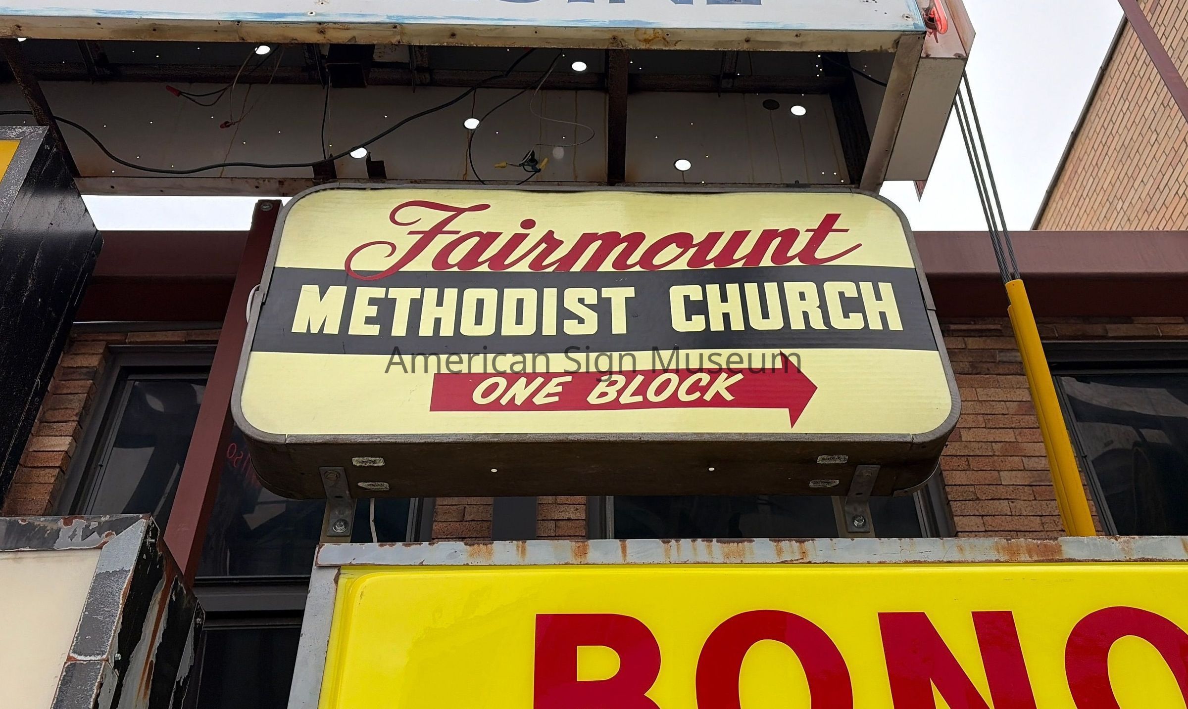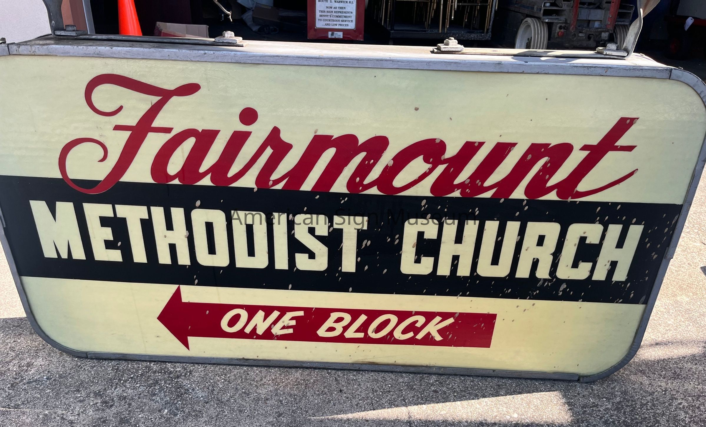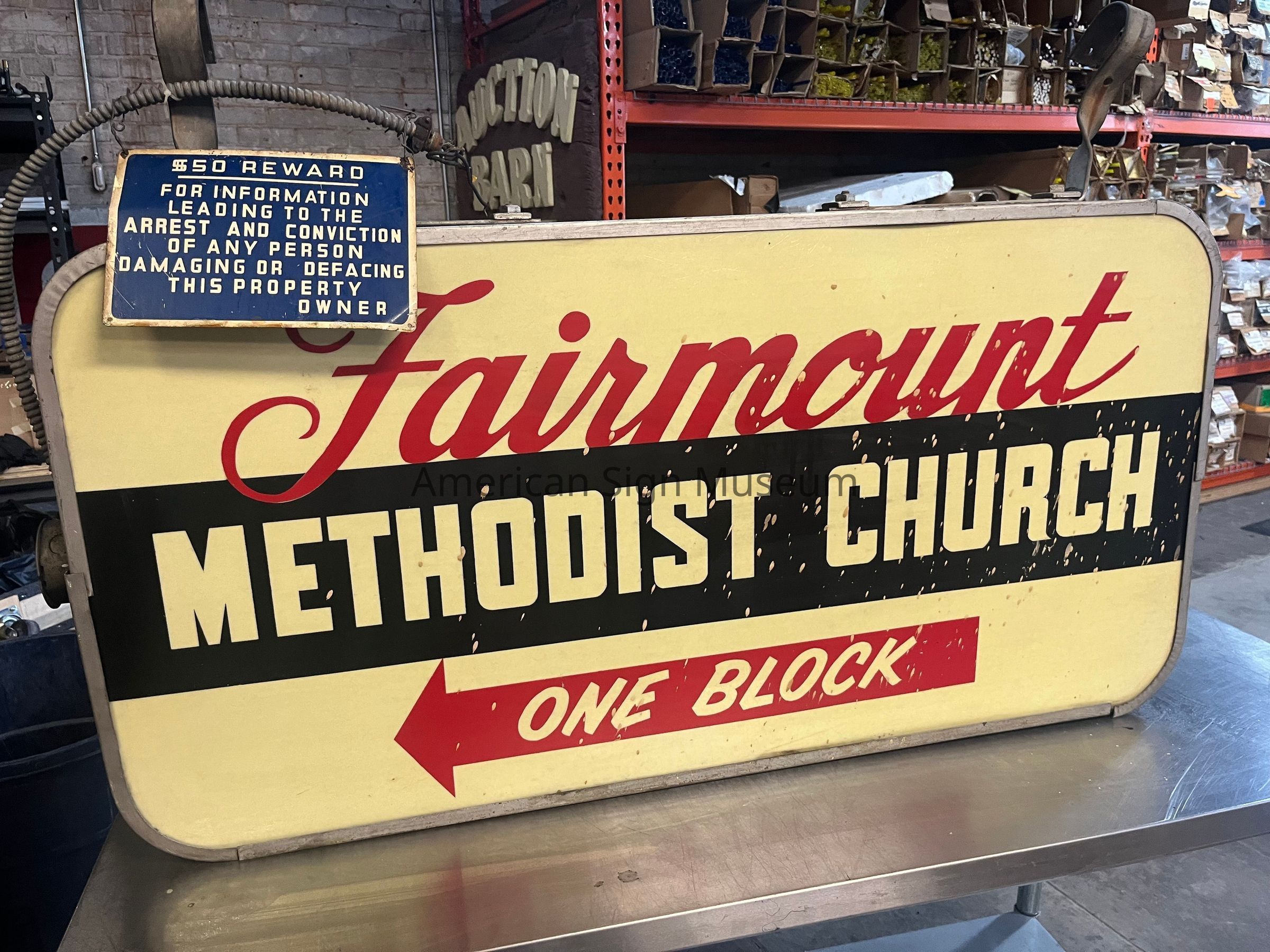 Double-faced internally LED-illuminated plastic sign with steel cabinet reading "Fairmount Methodist Church" with an arrow reading "One Block" painted with the spray-and-cut method.Collection