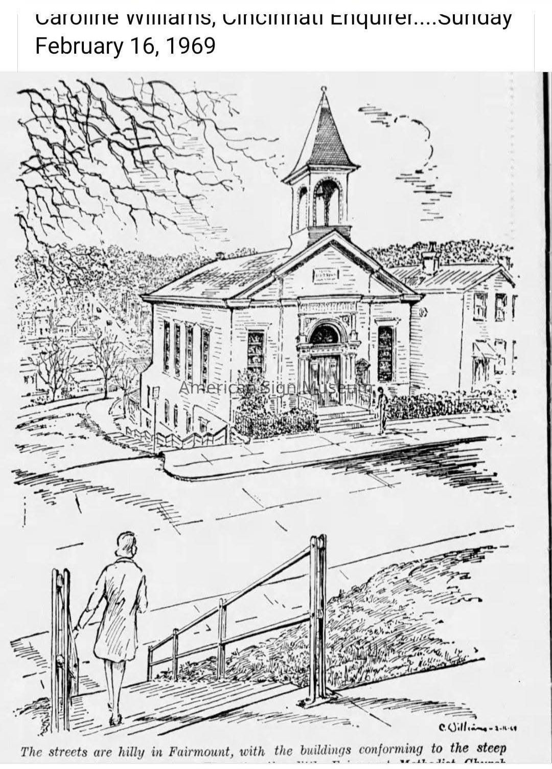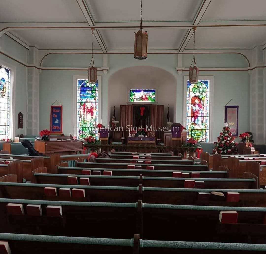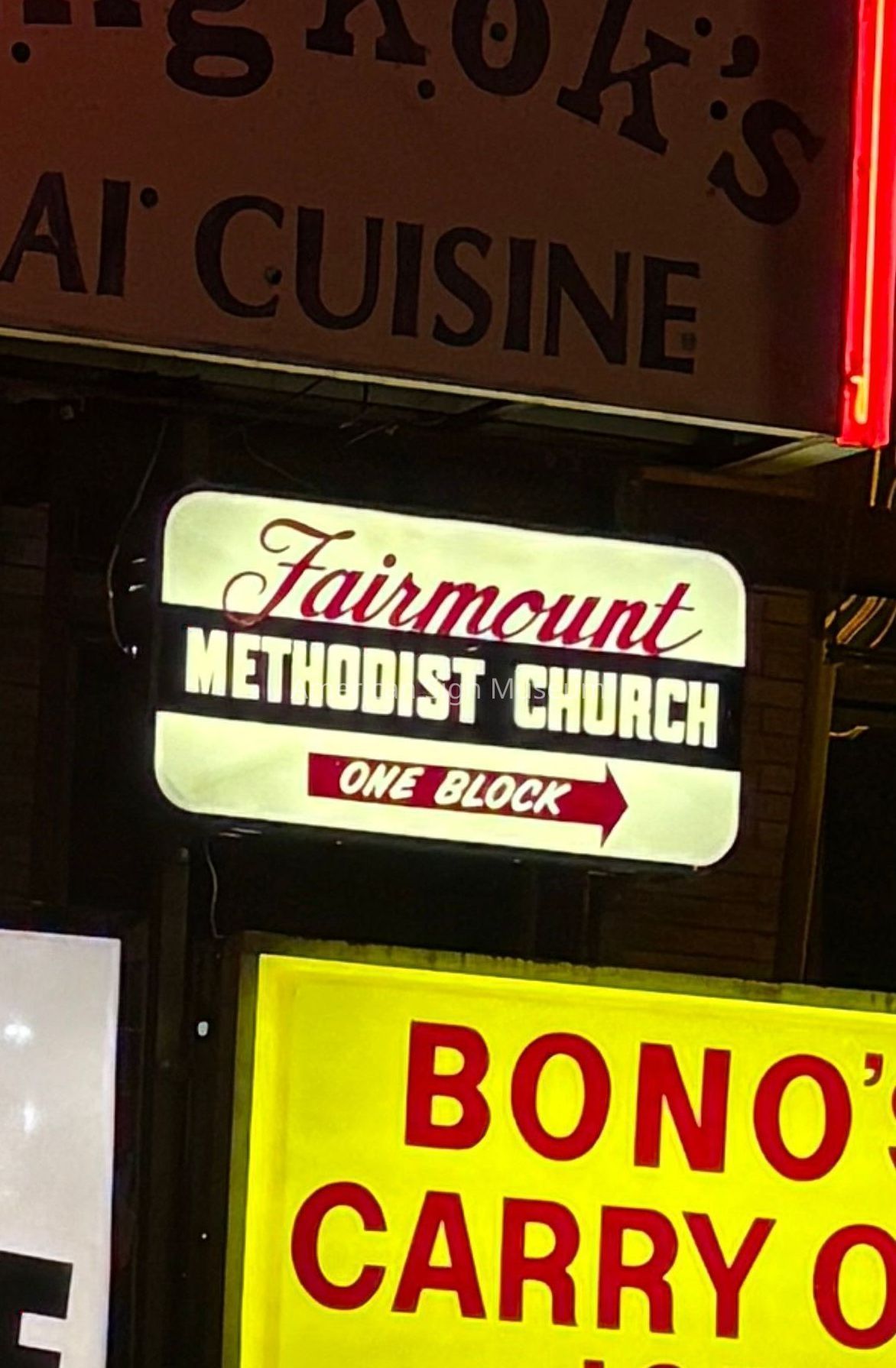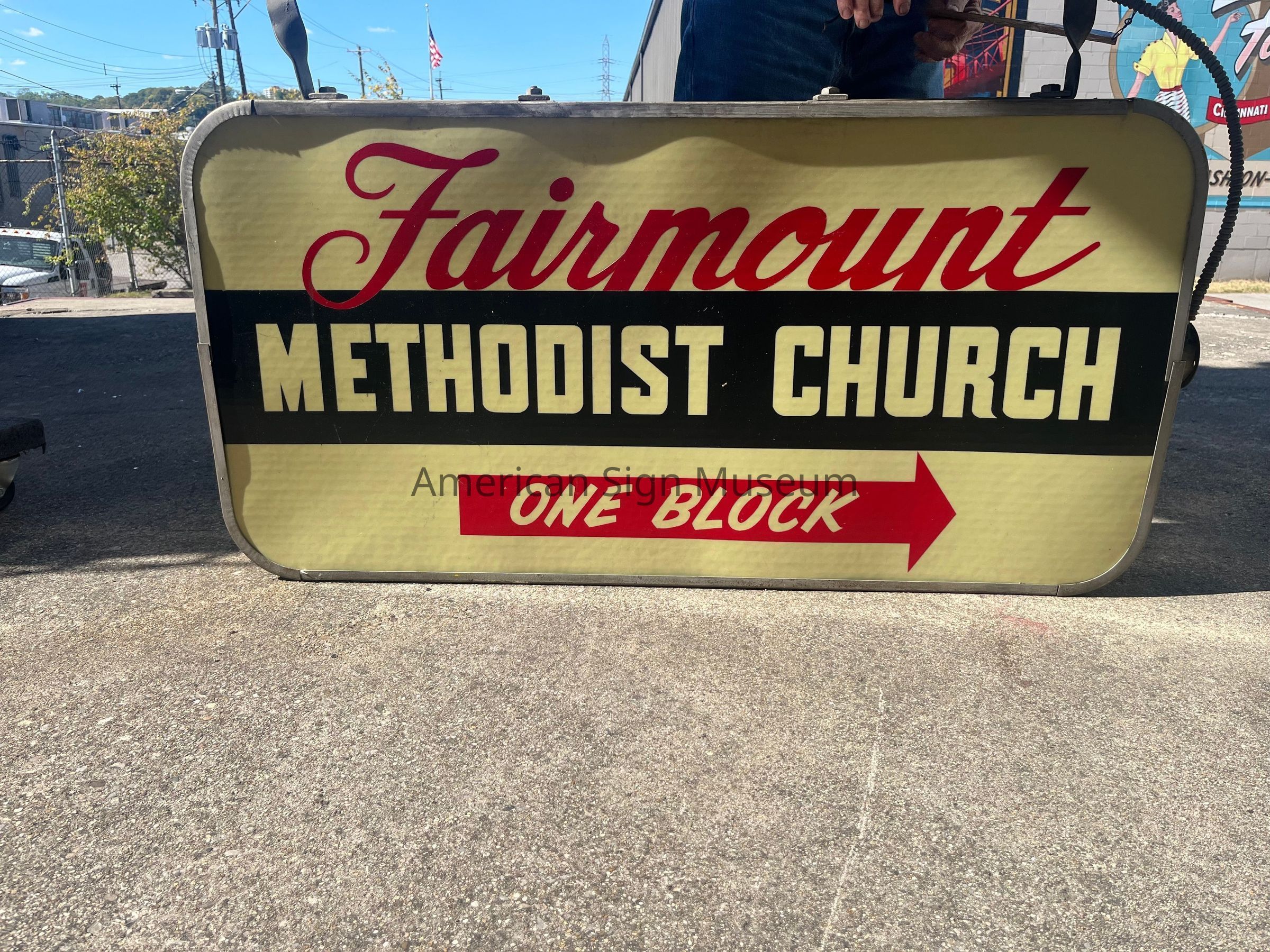 Double-faced internally LED-illuminated plastic sign with steel cabinet reading "Fairmount Methodist Church" with an arrow reading "One Block" painted with the spray-and-cut method.Collection