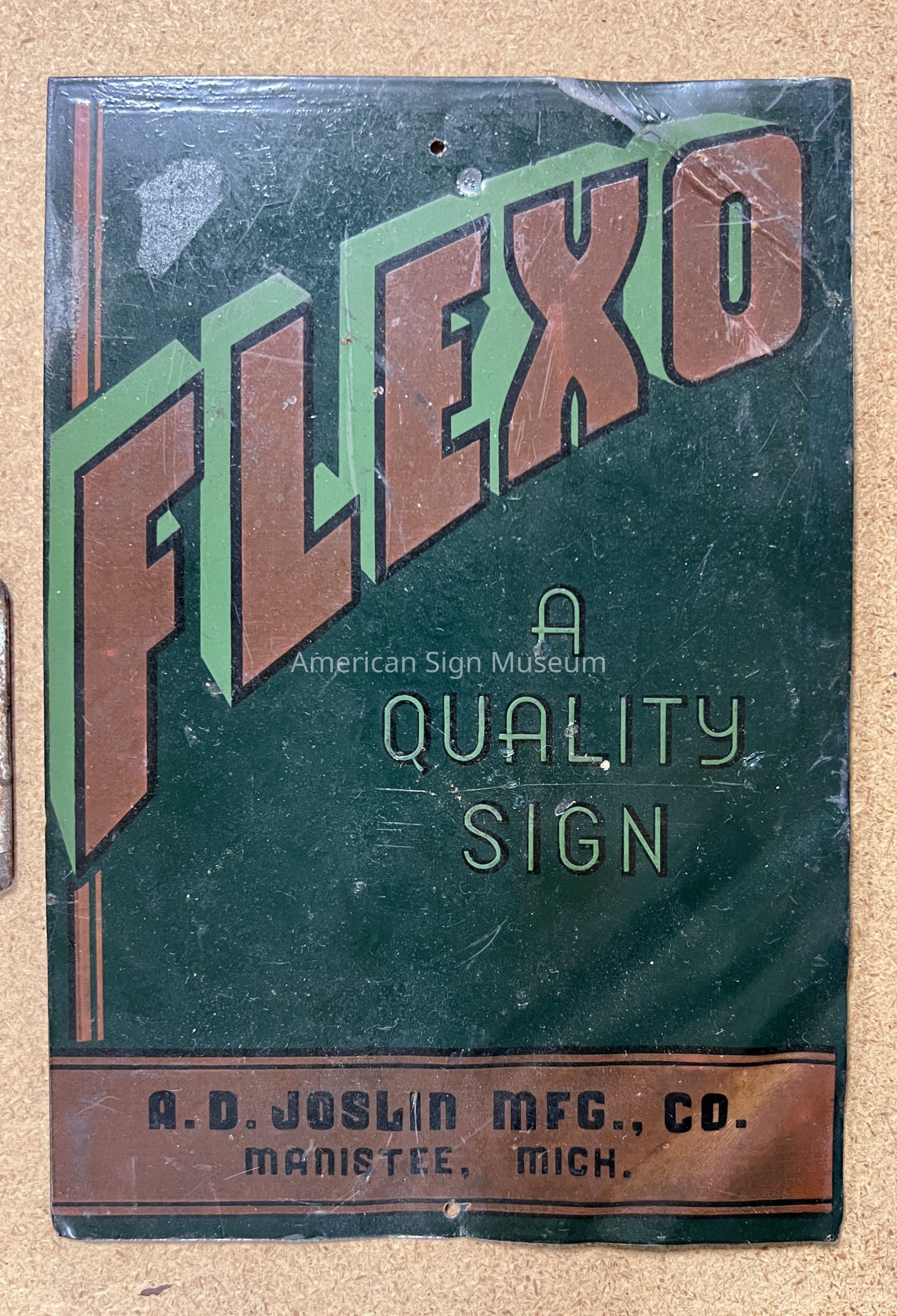 "Flexo - A Quality Sign" screen-printed sign tag has local dealer name: "A.D. Joslin Mfg., Co. - Manistee, Mich."Collection