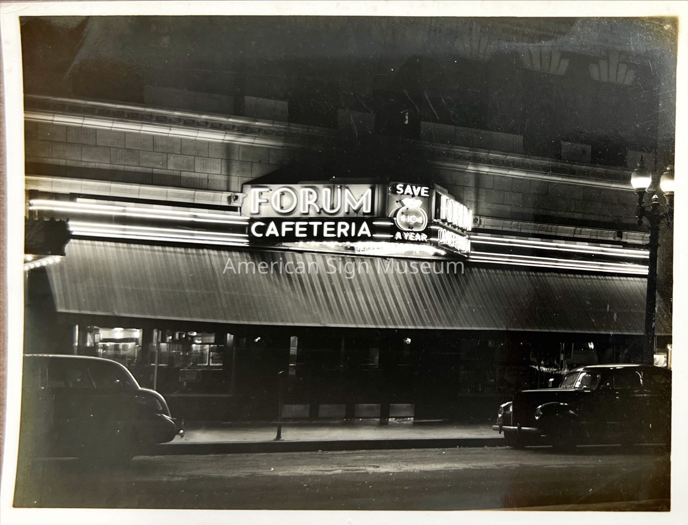 B&W photograph of early neon sign 1930-1940s - Forum Cafeteria. Photo was taken at night.Made/Created