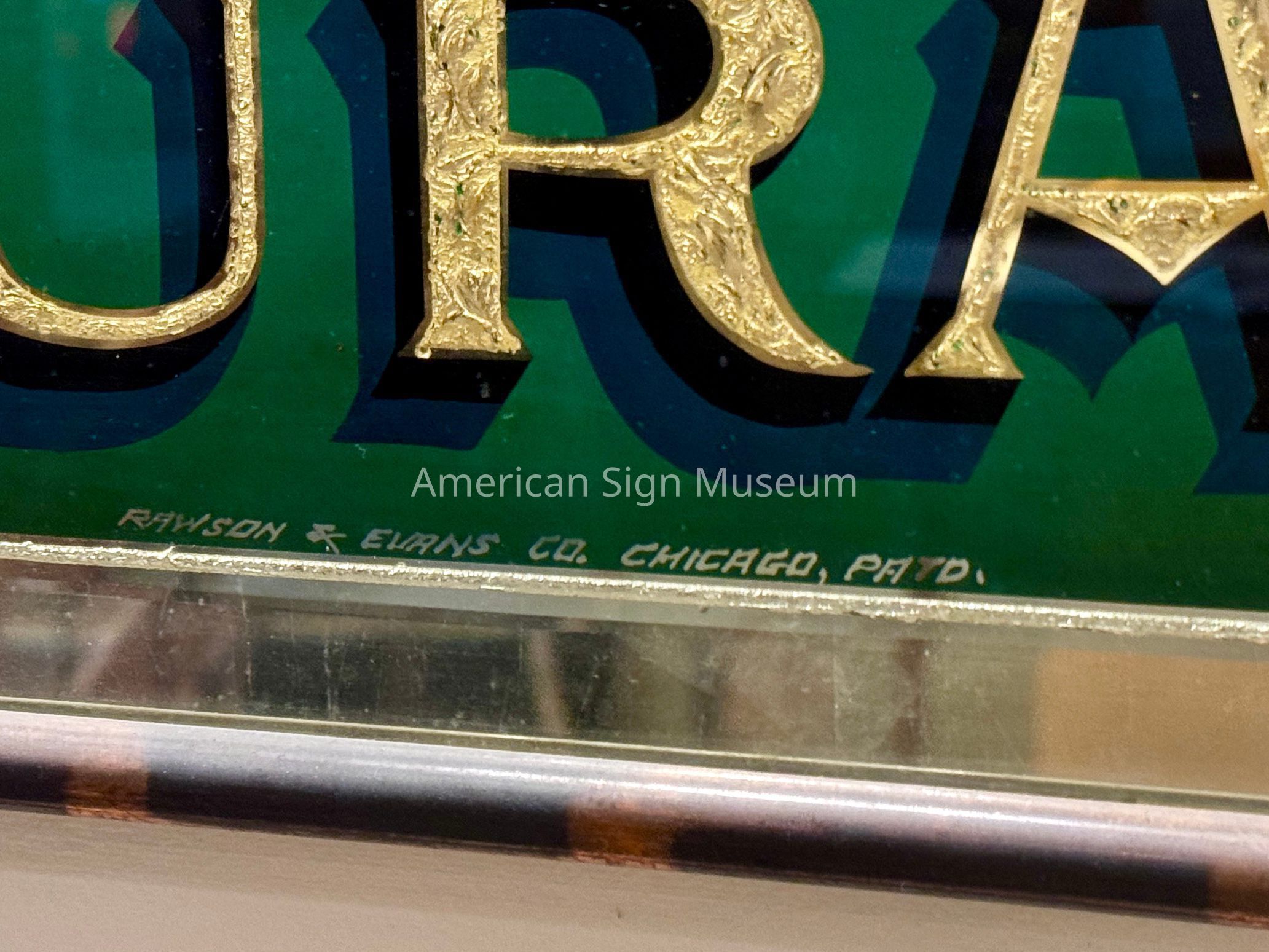 This copper-framed, reverse glass glue-chipped and gilded piece was the work of Chicago-based Rawson & Evans. Note the detail in the chipping; it was probably chipped twice since the sign would have been read at eye-level as opposed to the single-chipped sign techniques.Collection