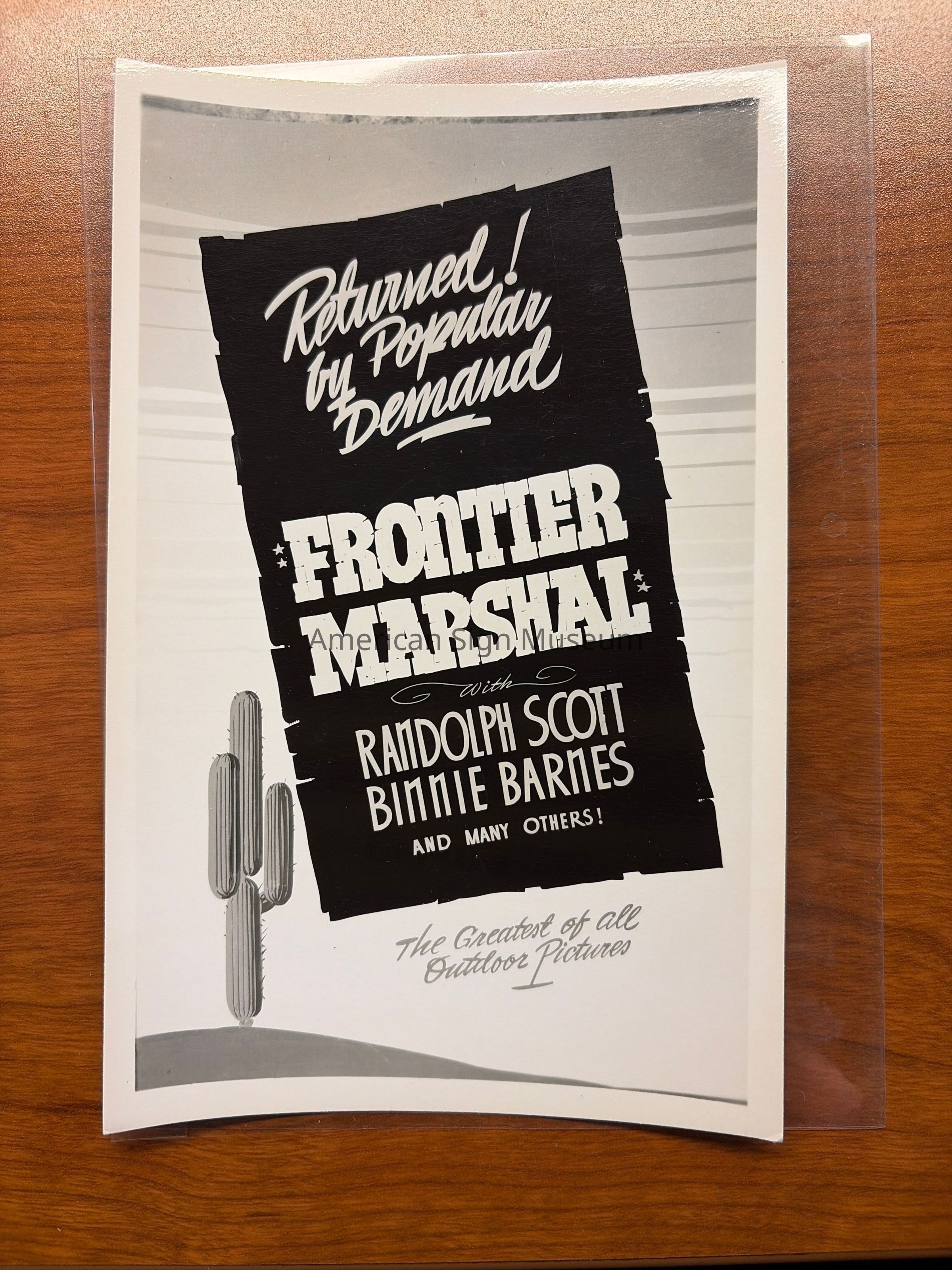 Black and white photograph of a show card reading "Returned! by Popular Demand Frontier Marshal with Randolph Scott Binnie Barnes And Many Others! The Greatest of all Outdoor Pictures". Made by Don SturdivantCollection