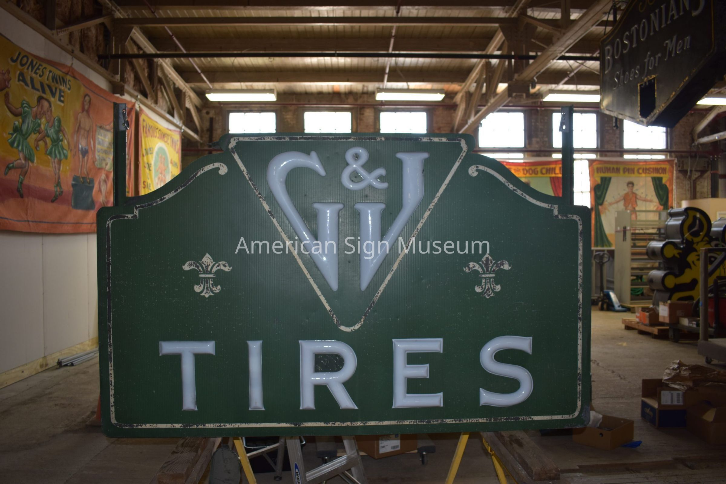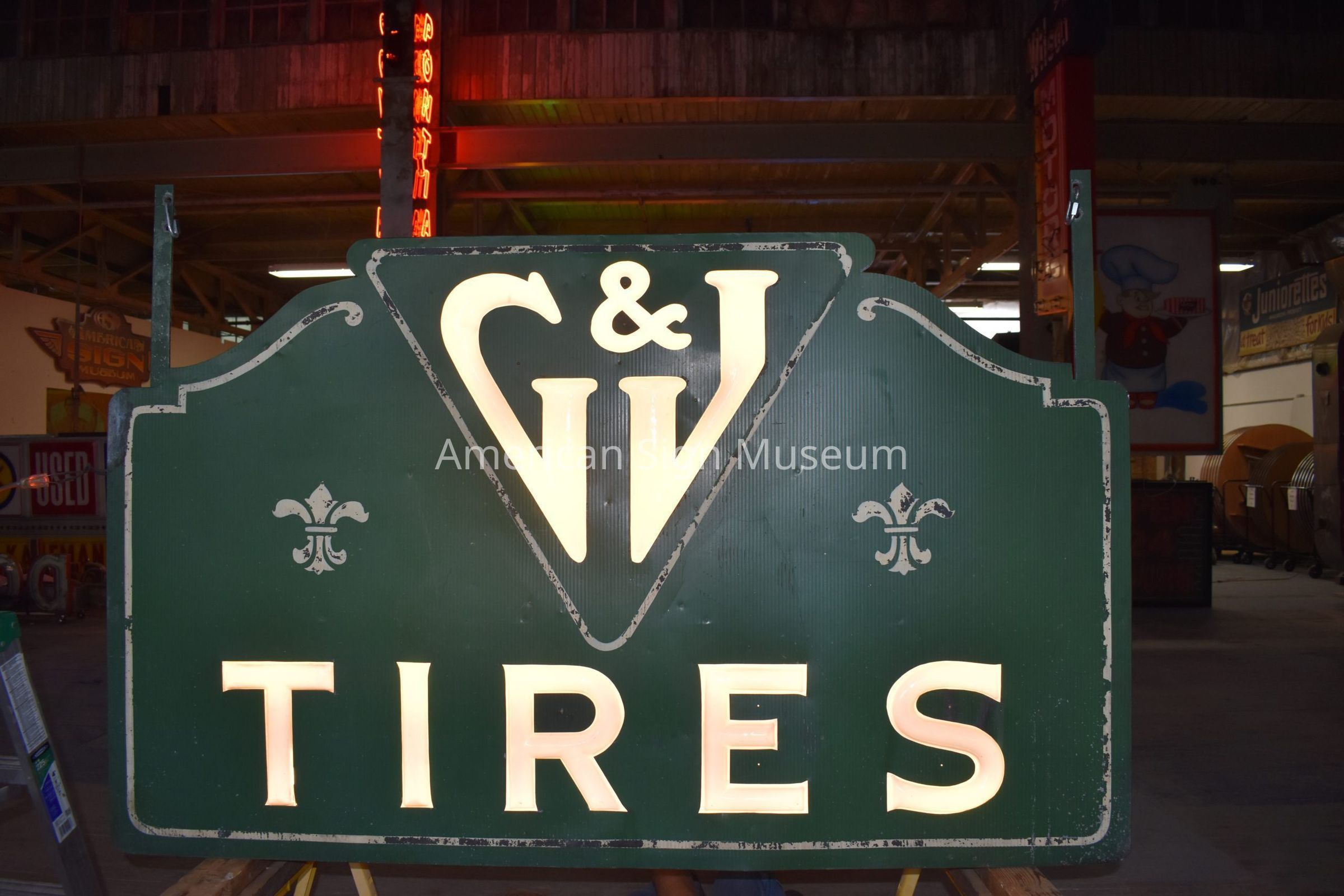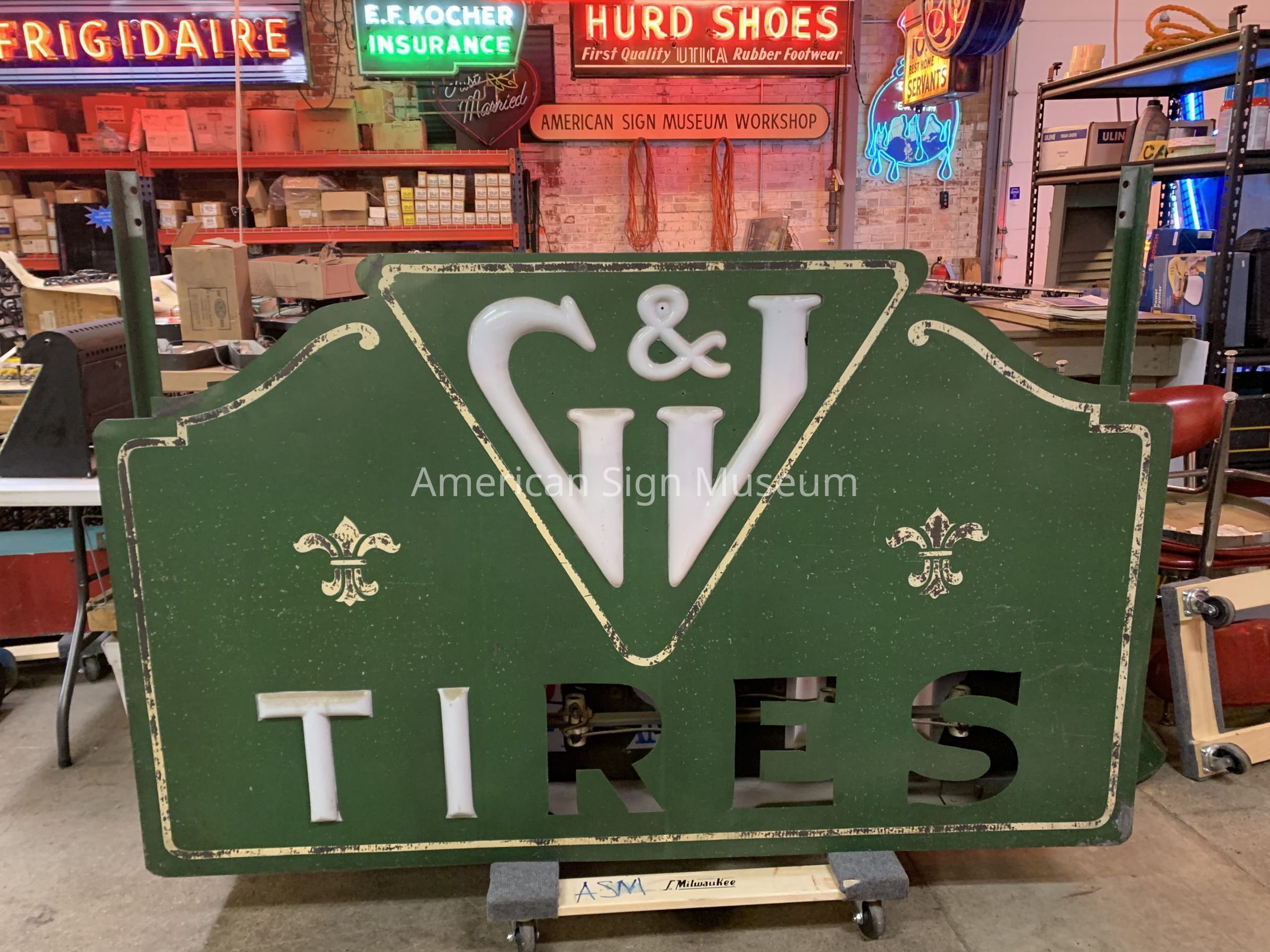 "G&J Tires" is double-faced, ripple tin sign with opal glass letters.Collection