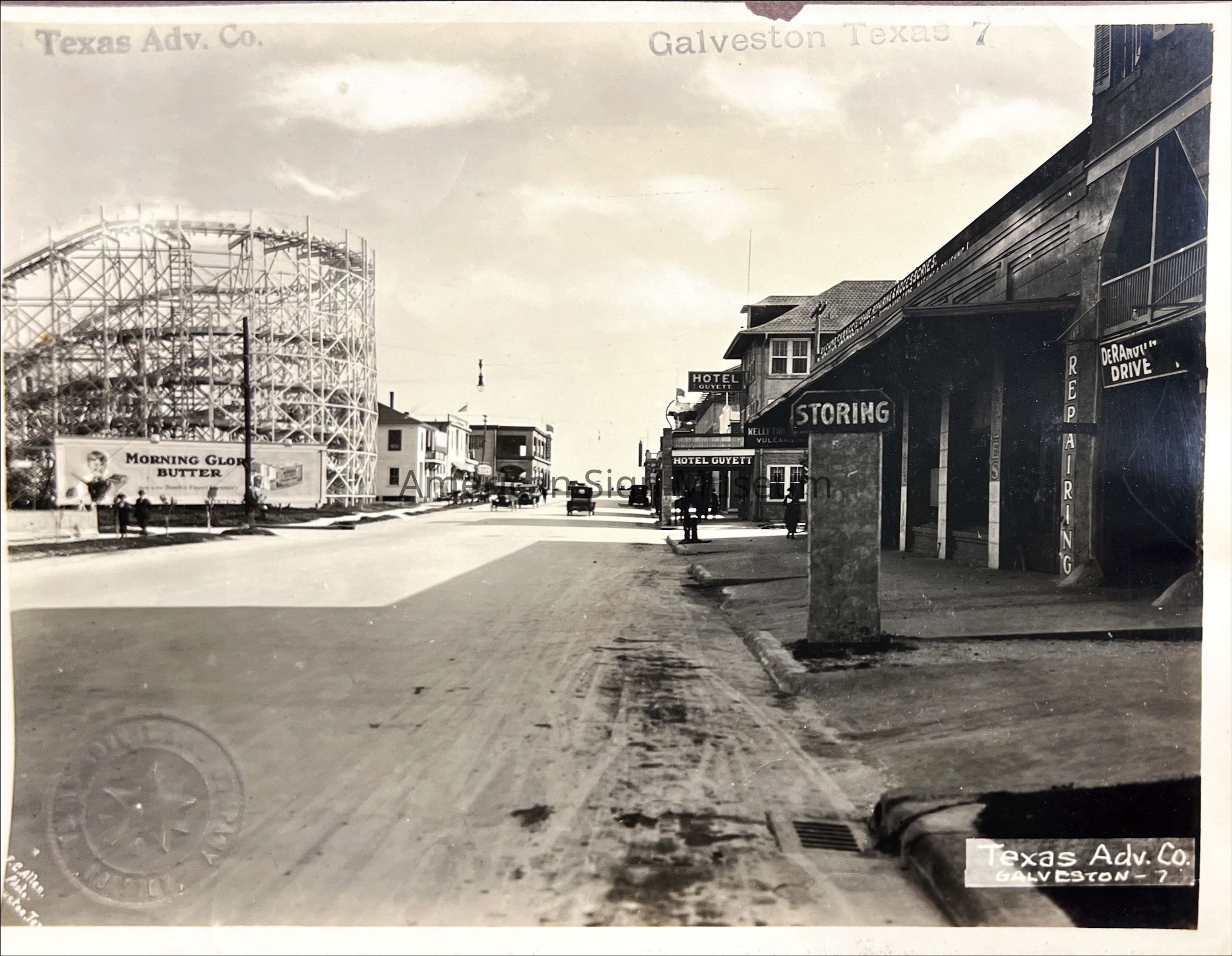 B&W photograph of early street scene - multiple signs - "23rd & P" Galveston TX. Stamp reads Texas Advertising Company, Houston TX.