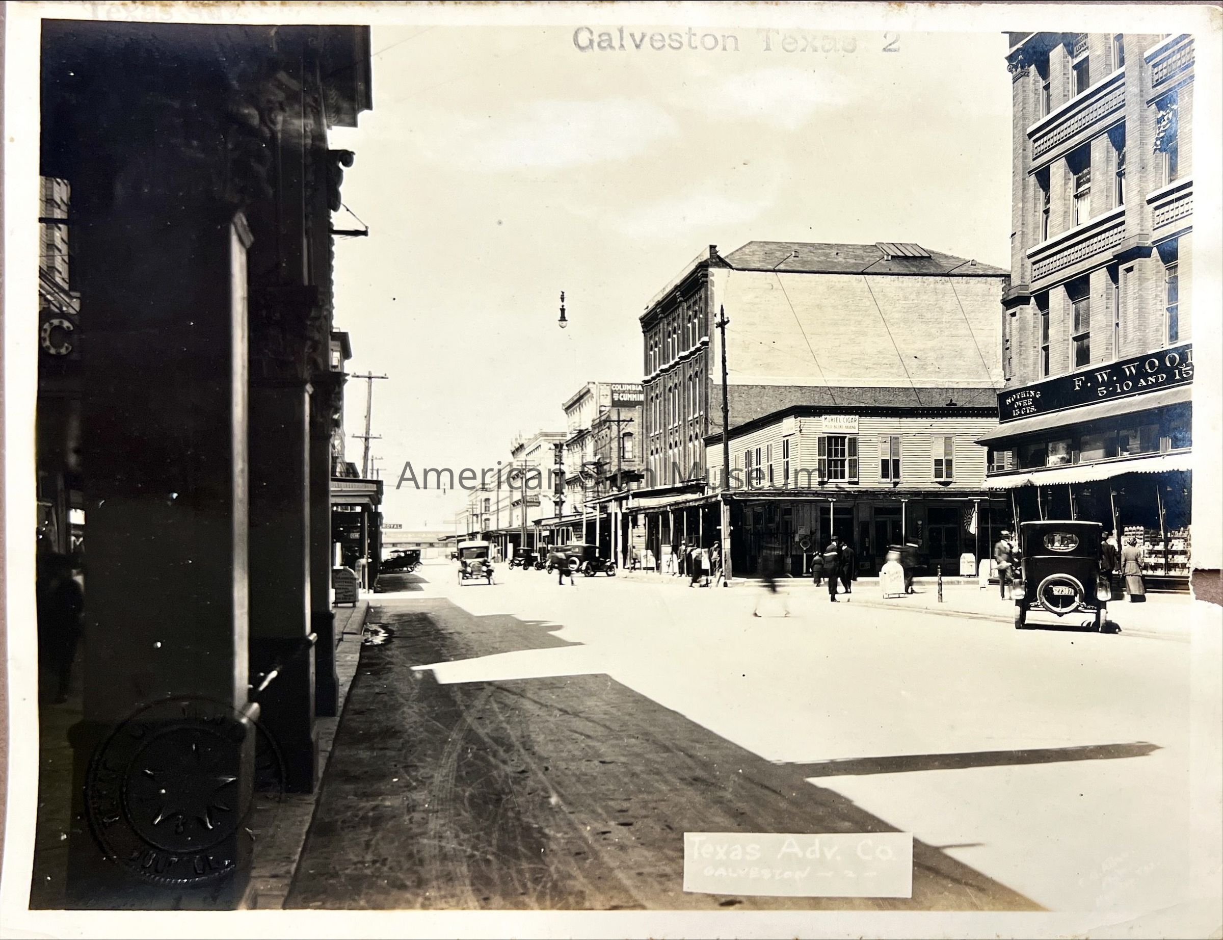 B&W photograph of early street scene - multiple signs - "23rd Street near Market" Galveston TX. Stamp reads Texas Advertising Company, Houston TX.