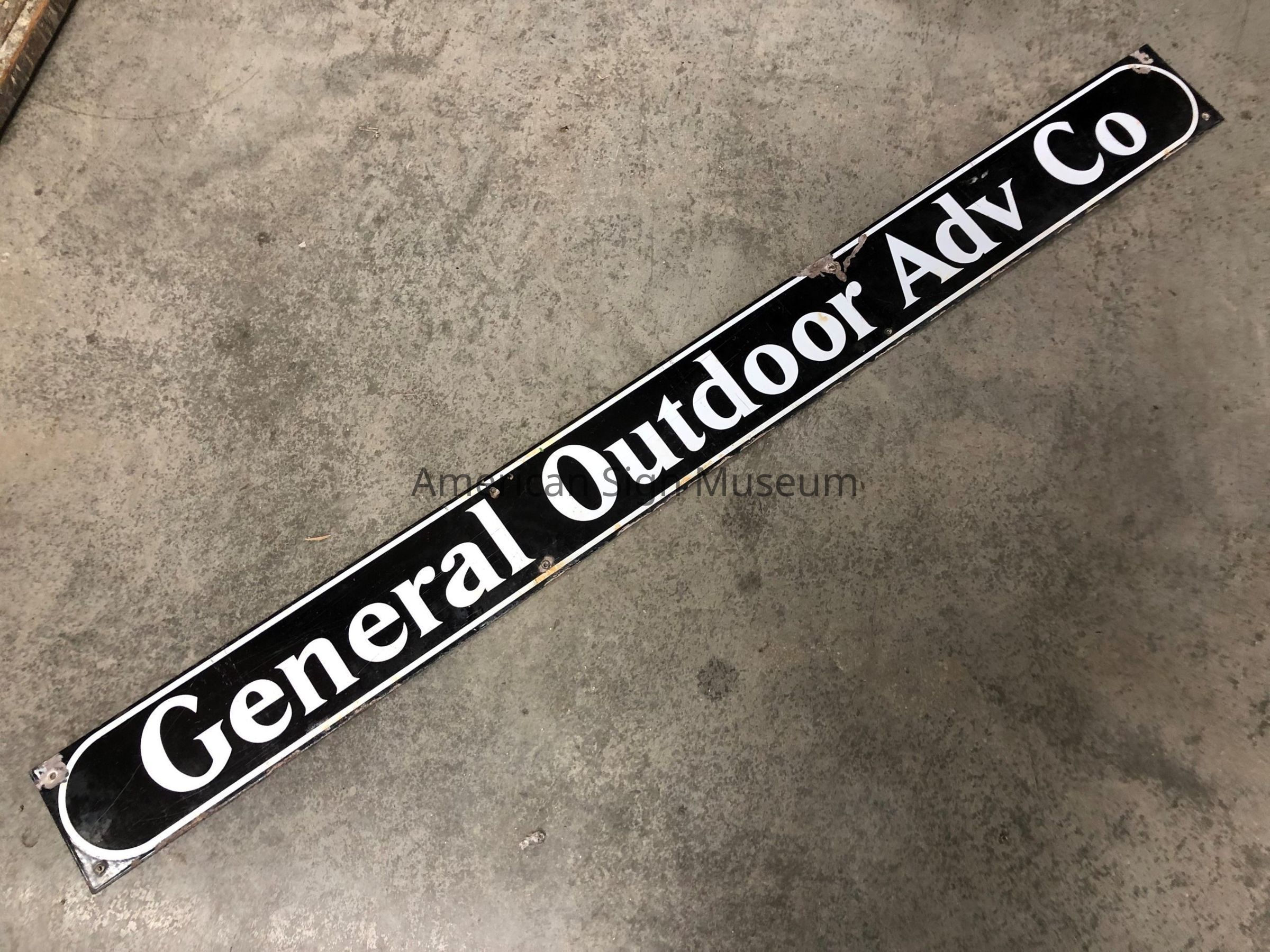 Porcelain enamel black-and-white sign tag panel reading, "General Outdoor Adv Co" for the General Outdoor Advertising CompanyCollection