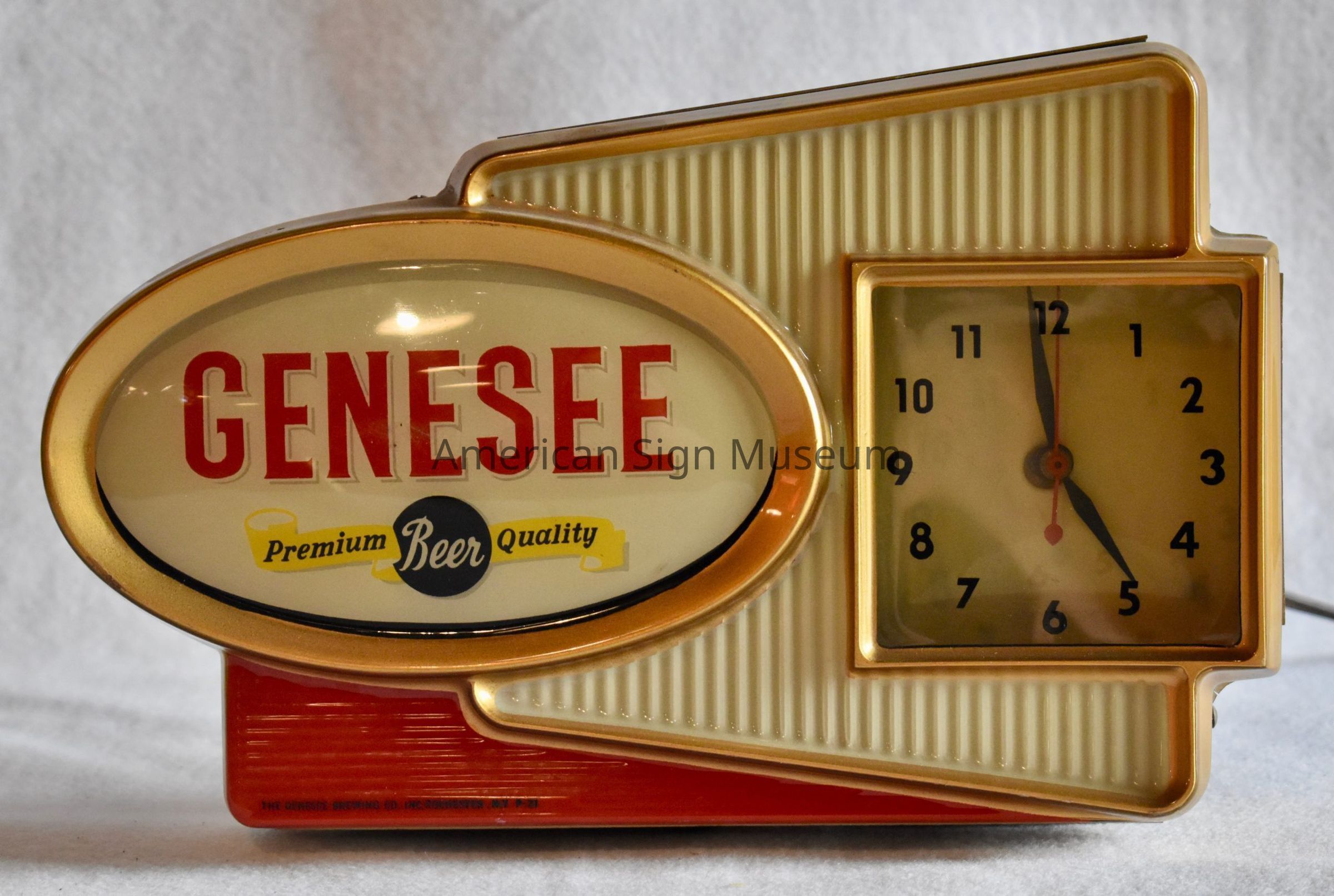 Genesee Beer plastic point-of-purchase sign and clock is intricately vacuum-formed/embossed and irregular in shape.Collection