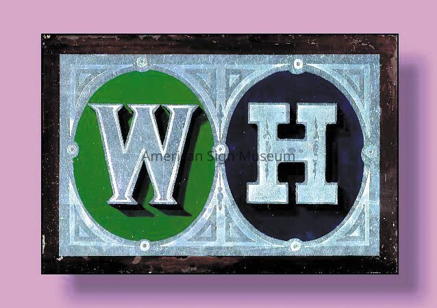 One double-sided glass panel of a collection of 9 gilded and decorated glass panels. This panel depicts a, "W," and, "H," on one side, with a fancy, "O" with drop-shadow on the other side.