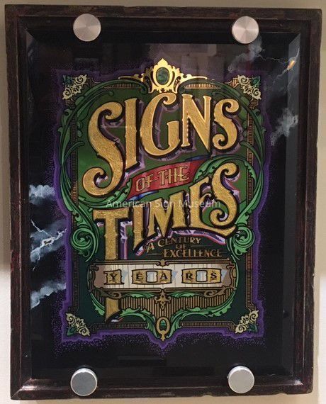 Fancy goldleaf glass plaque was created during the "Safari at the Zoo II" Letterheads meet in June 2006 in Cincinnati, OH. Artwork was designed by David Butler and created by Don Eckland in celebration of the 100th Anniversary of Signs of the Times Magazine. Sign is screen-printed, hand-lettered, and gilded and incorporates powea shell for accents.Collection