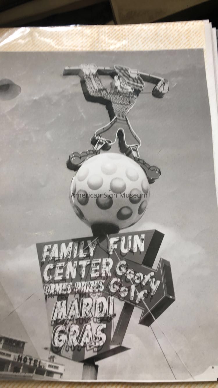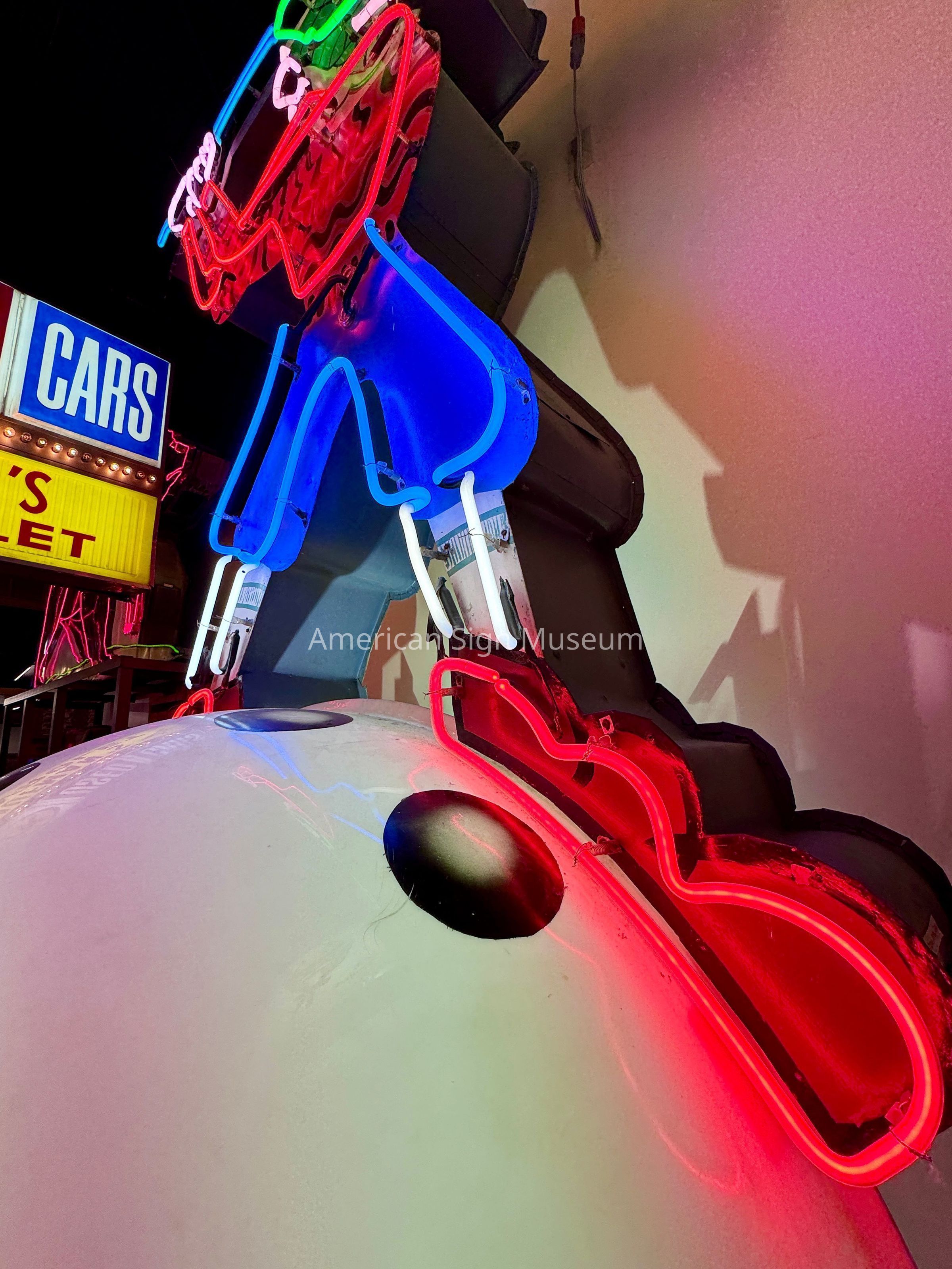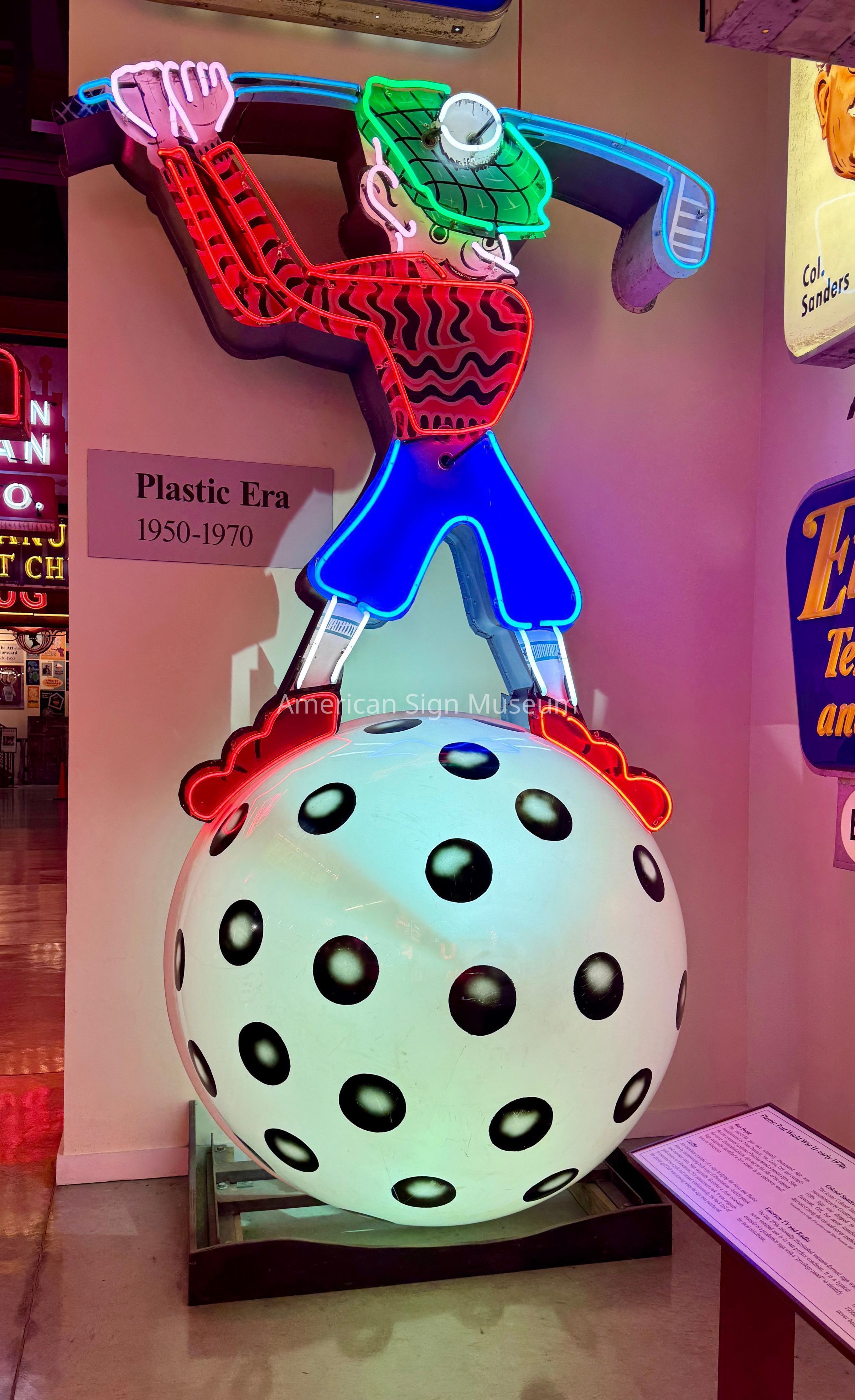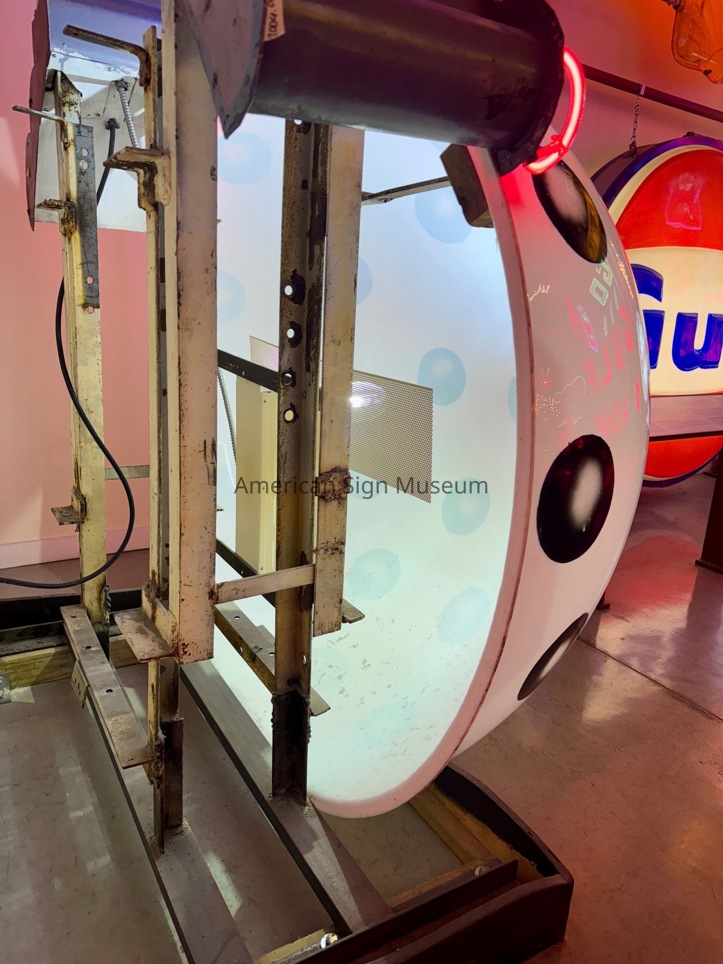 This sign is an excellent example of a sign that bridges the Neon and Plastic Eras because it has both types of illumination: backlit plastic and exposed neon. The sign shows a golfer atop a golf ball which originally identified a short nine-hole golf course at a Rochester, NY amusement park. Also, it originally was mounted on a pole and rotated. Unfortunately, the back half of the plastic golf ball was missing when the sign was acquired.Collection
