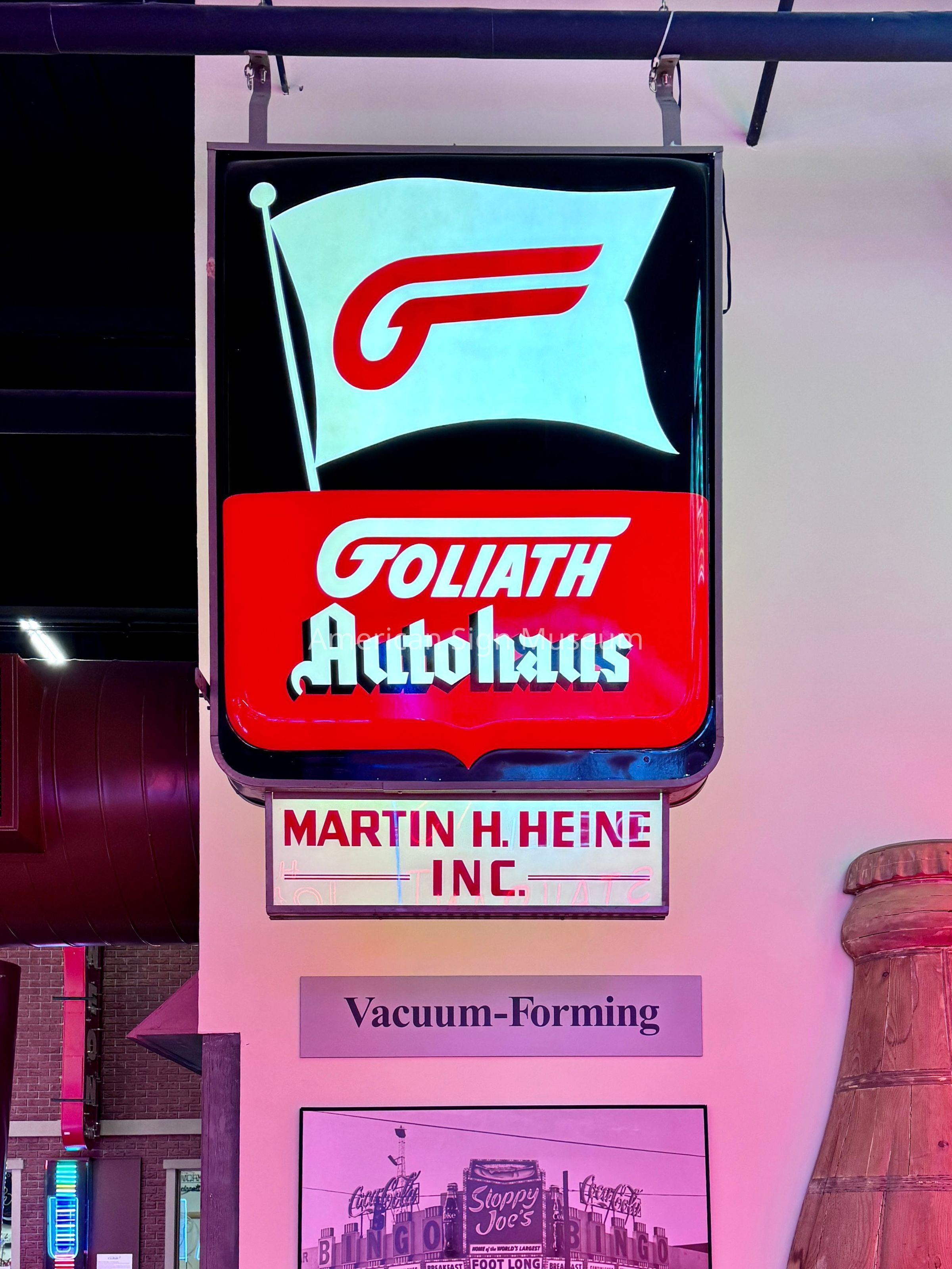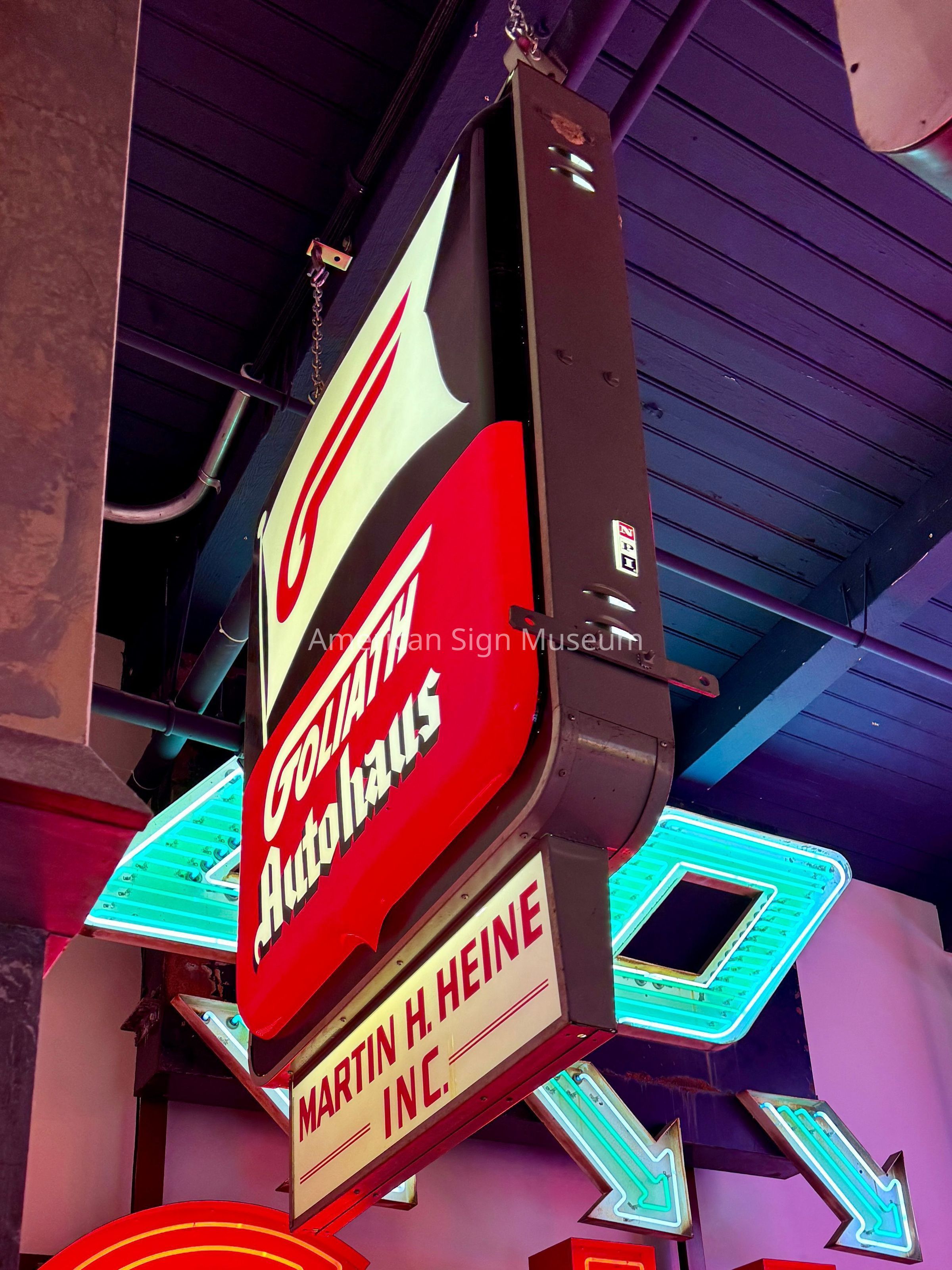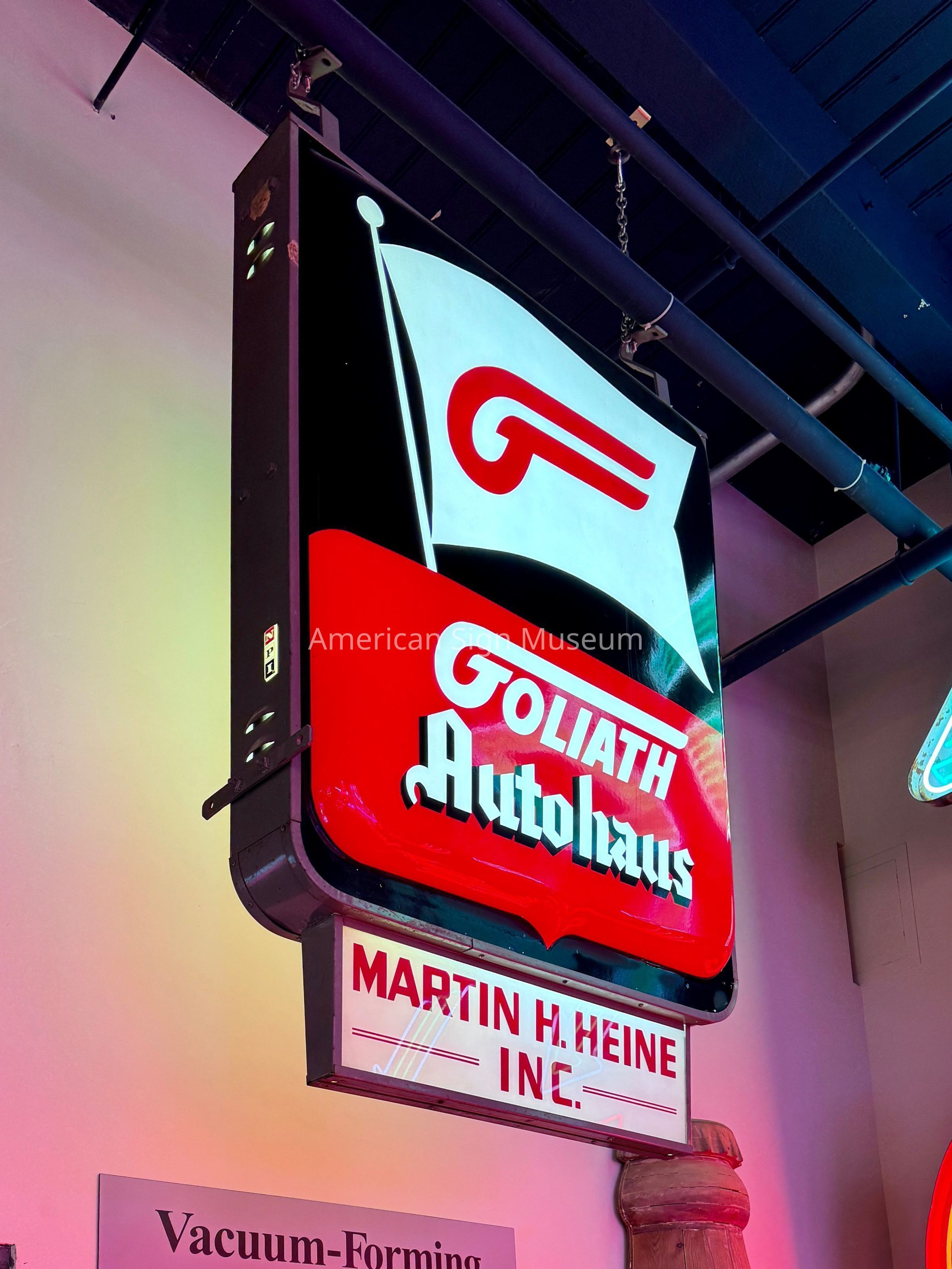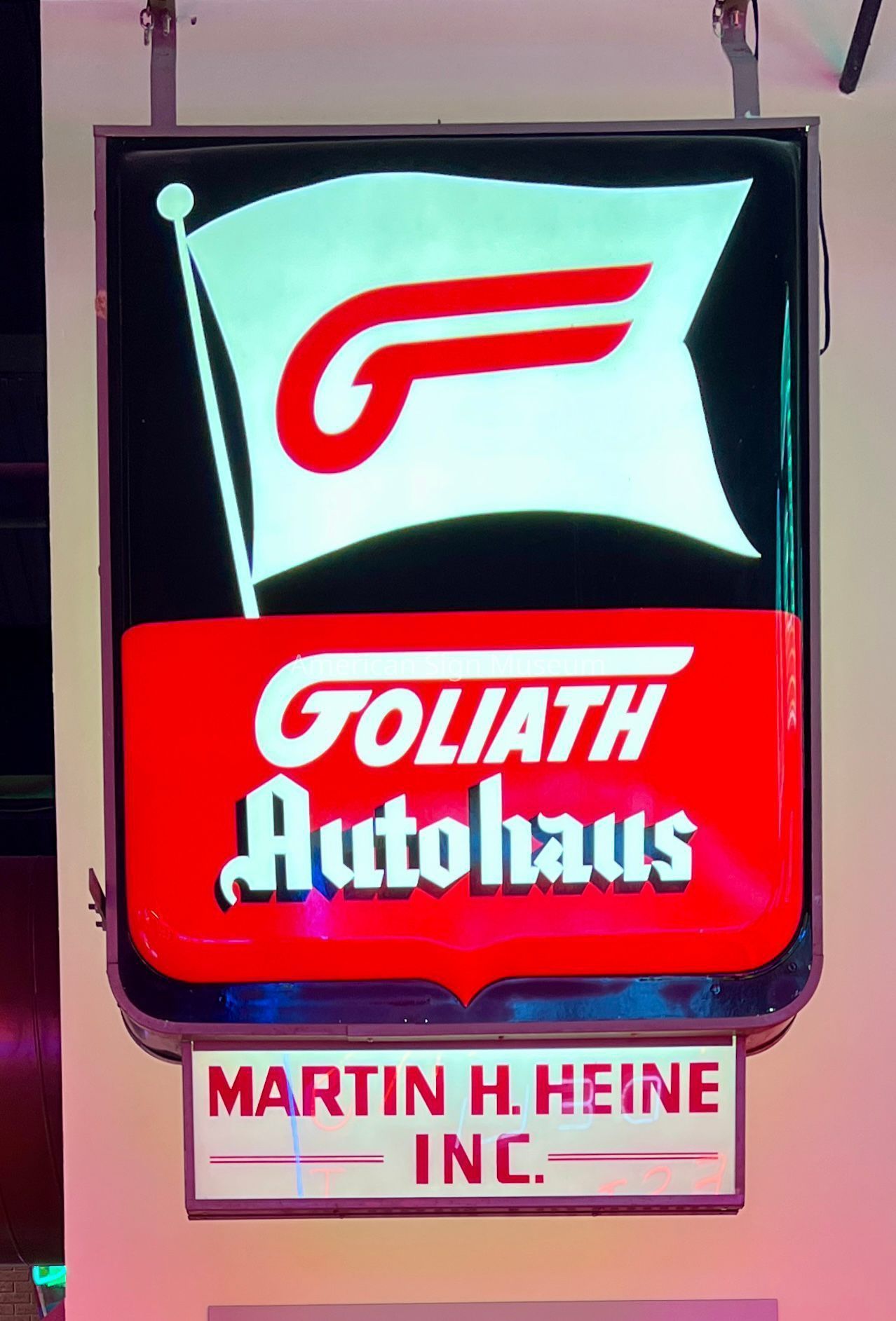 Double-faced, internally illuminated plastic sign for Goliath Autohaus and has lower privilege panel that reads, "Martin H. Heine Inc."Collection