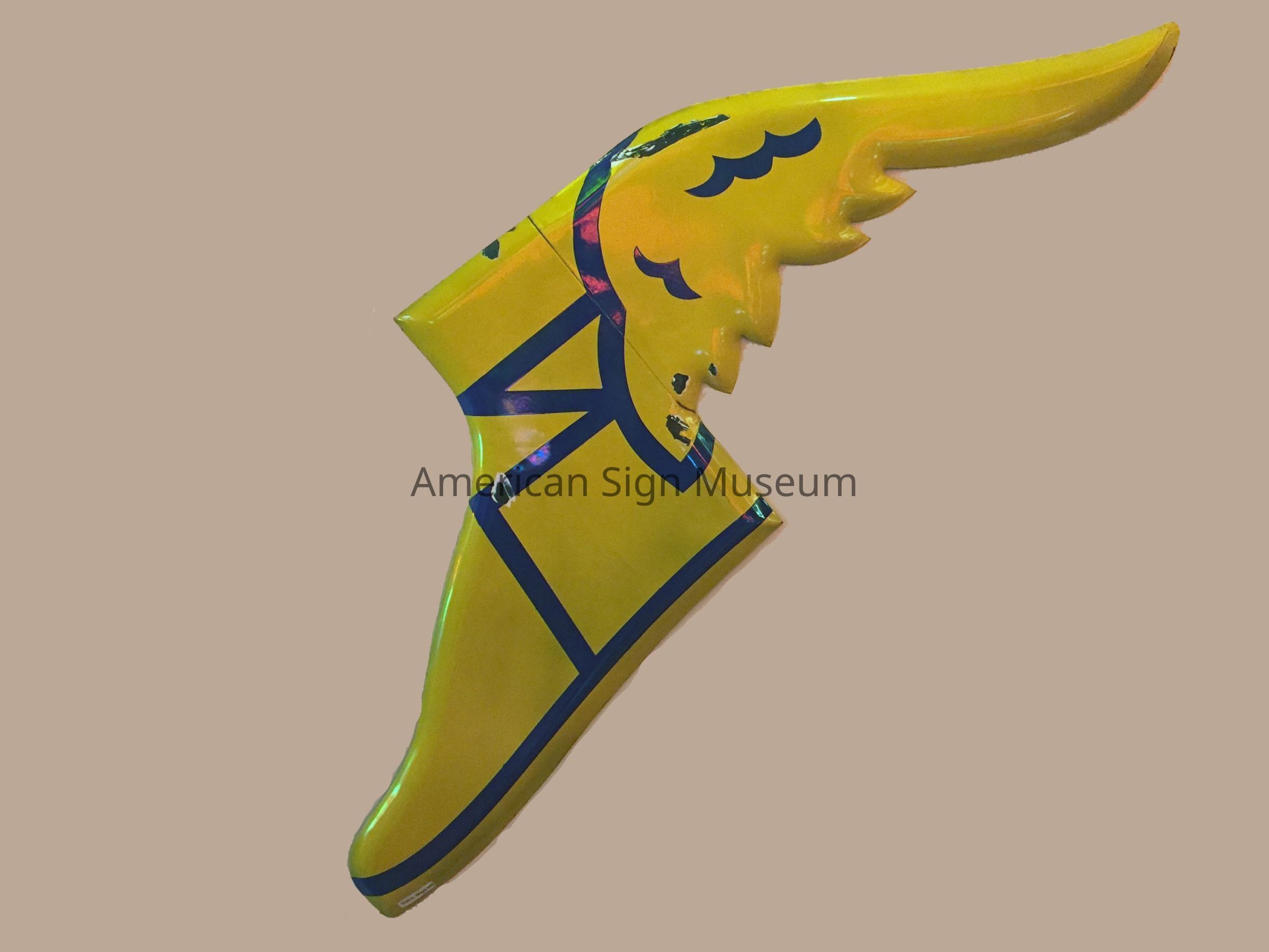 Porcelain enamel embossed winged Goodyear foot is yellow with blue graphics.Collection