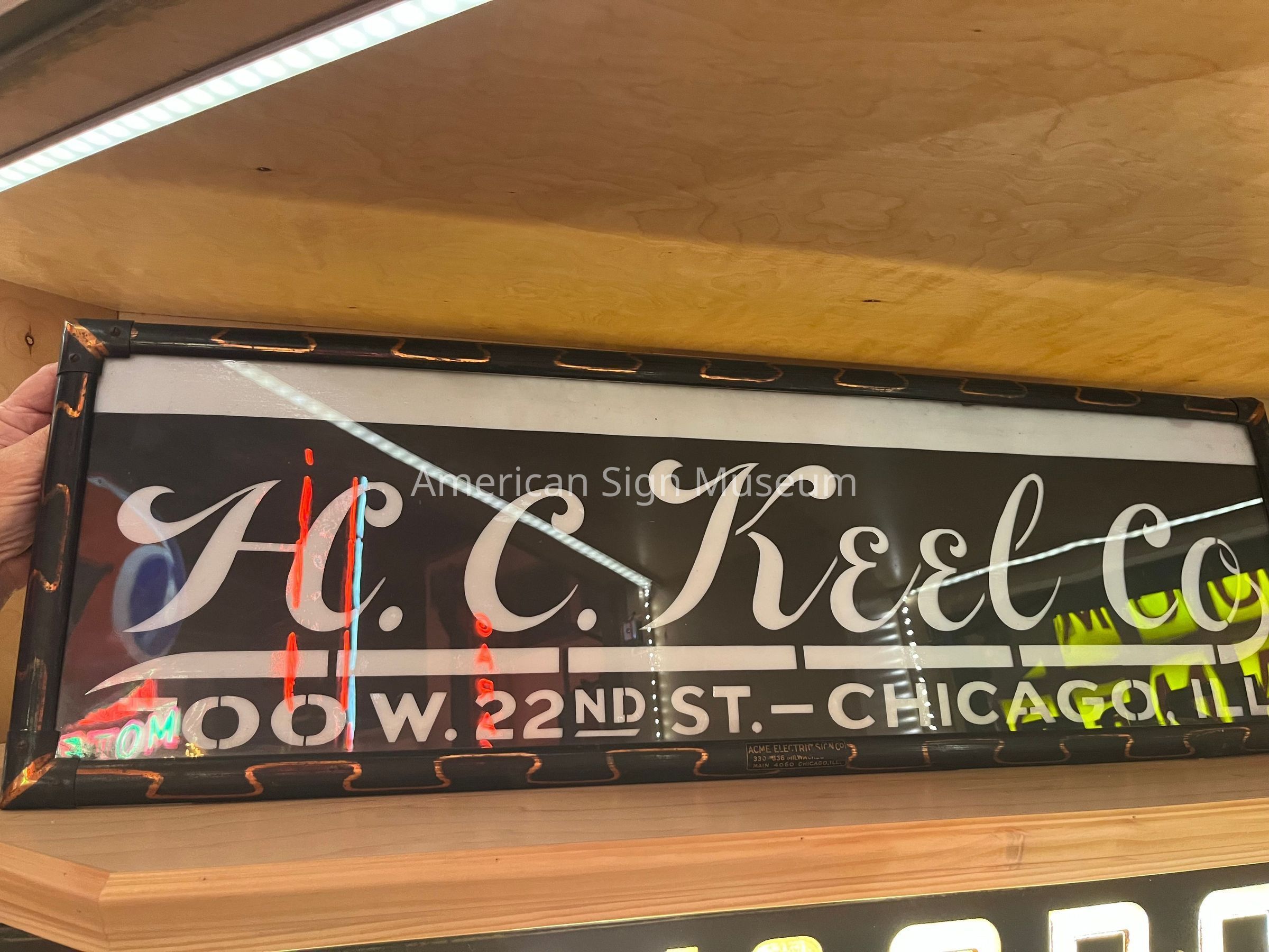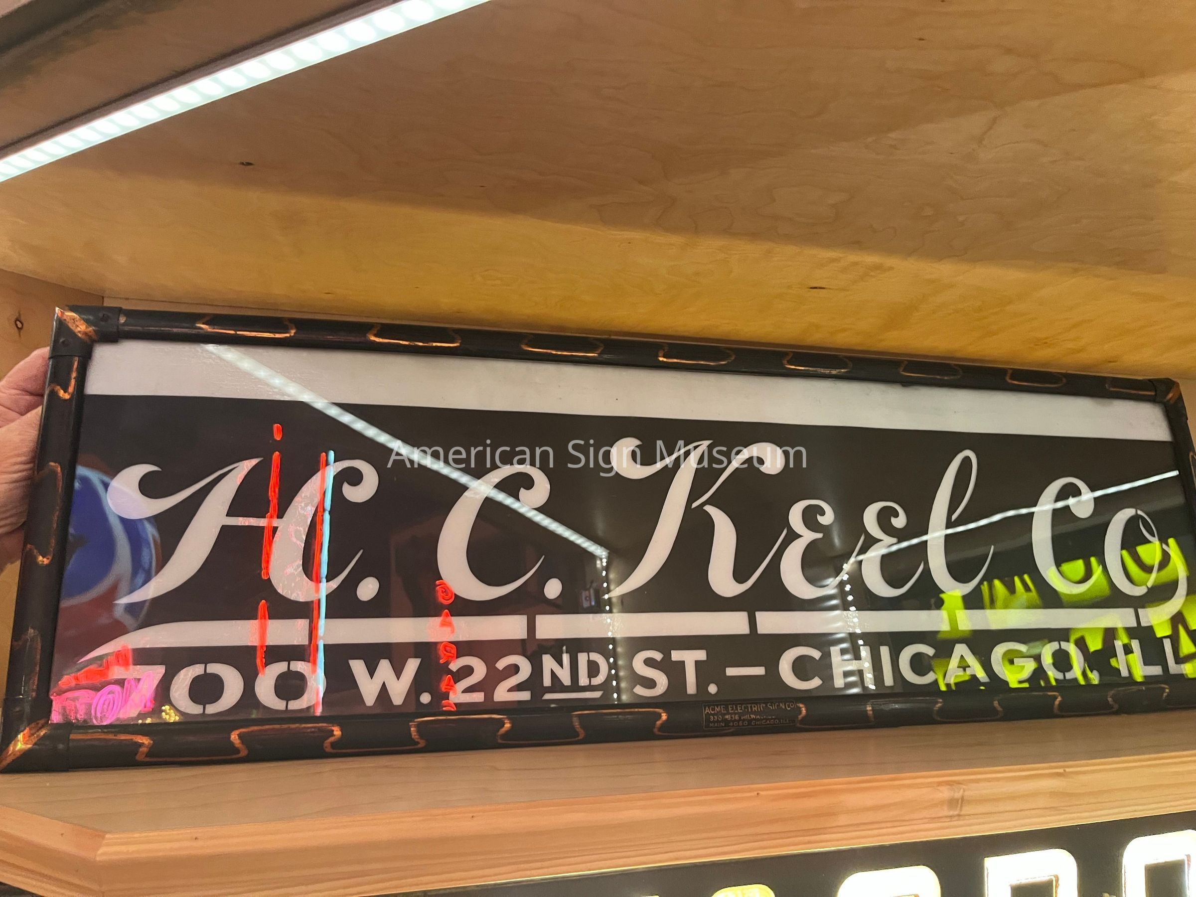 This point-of-purchase (POP) sign from about 1935 utilizes a die-cut black mask over a white milk glass panel and is internally illuminated with an incandescent lightbulb. It was manufactured by Acme Electric Sign Company, Chicago, IL.Collection