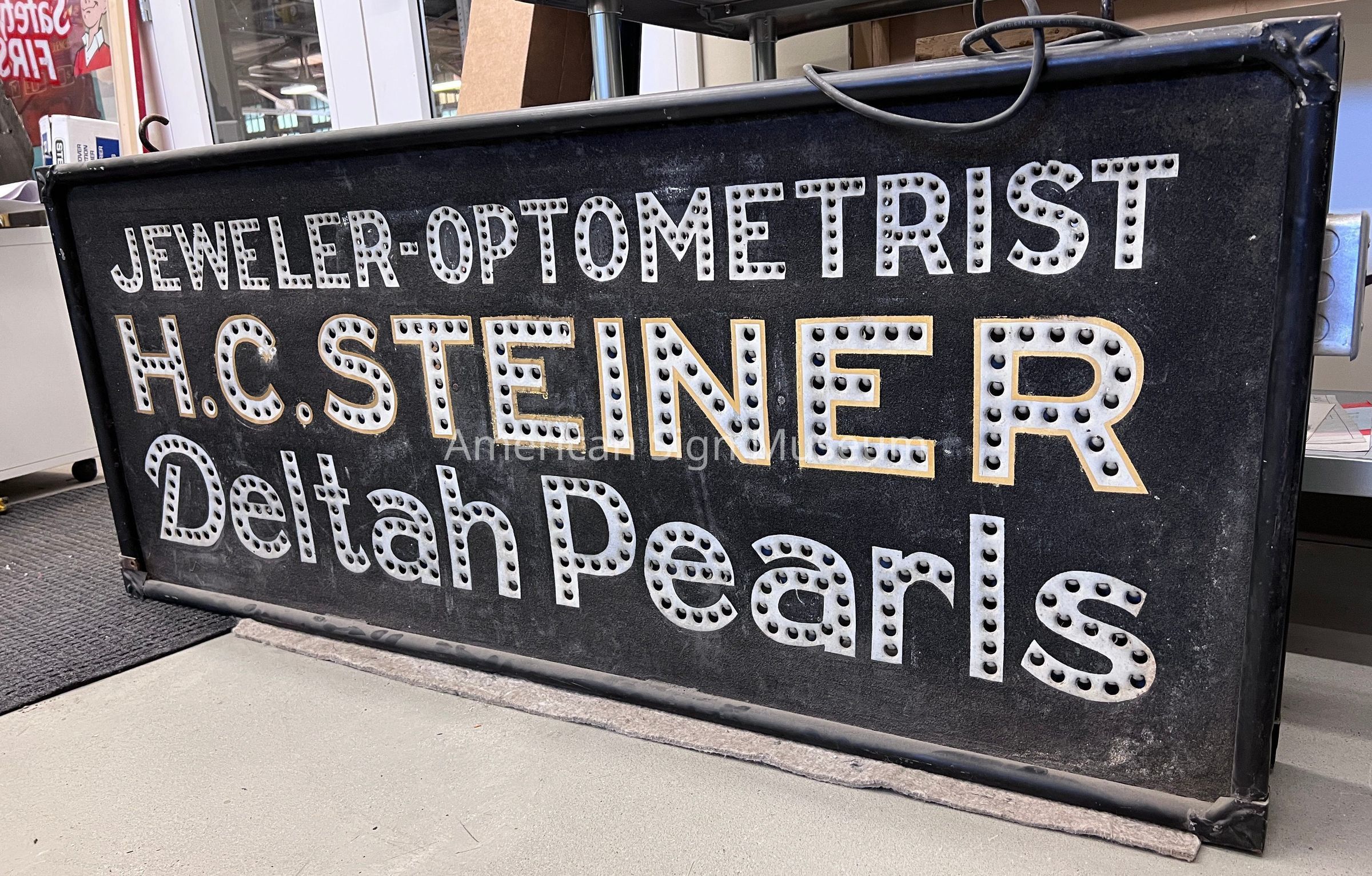 This double-faced, internally-illuminated metal sign reads, "Jeweler-Optometrist H.C. Steiner." It also advertises delta pearls. The illumination is provided by bulbs whose light shines through holes on the face, "punch-outs" spelling the individual letters. The sign was manufactured by the McSavaney Company based out of Springfield, OH in the 1920s.Collection