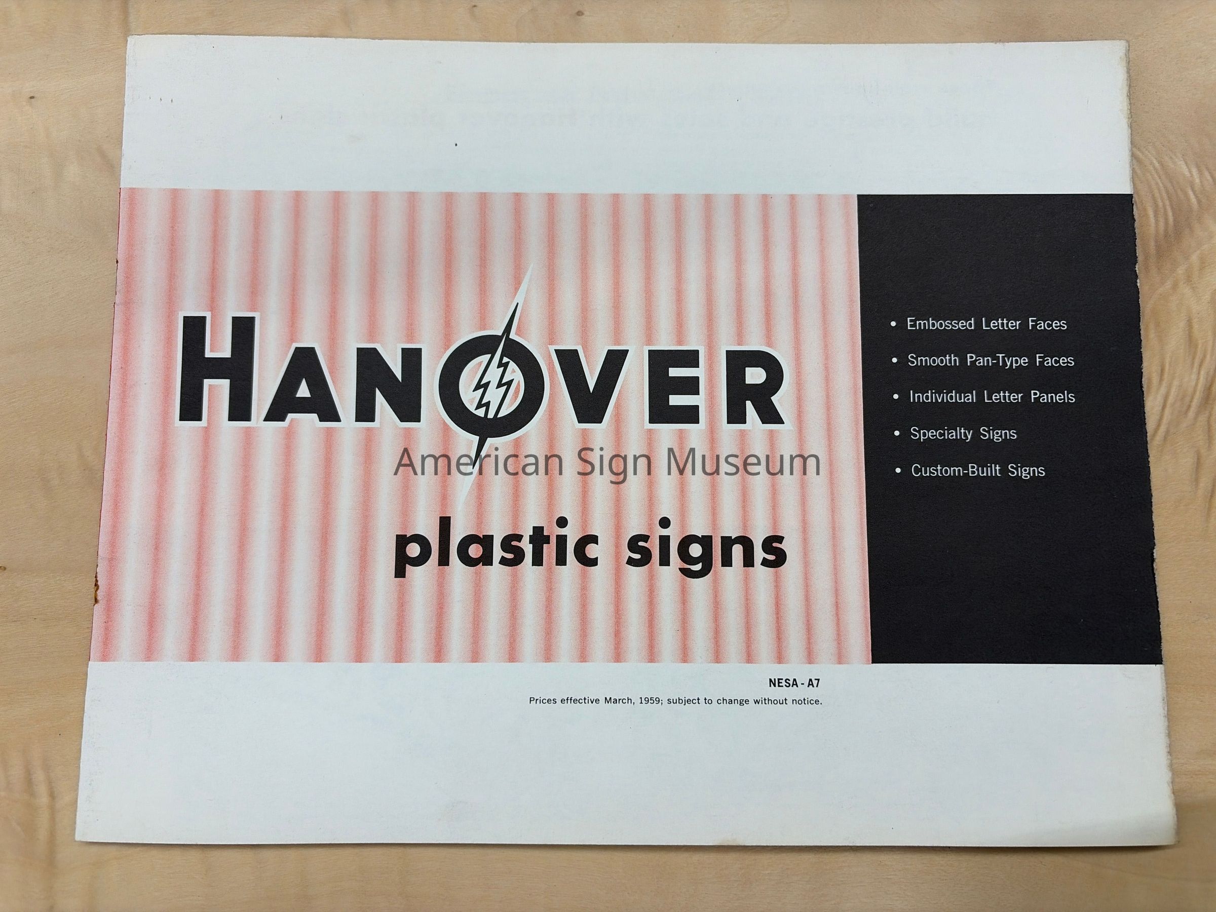 "Hanover Plastic Signs" catalog includes embossed letter faces, smooth pan-type faces, individual letter panels, specialty signs and custom-built signs. 12 pages; two-color.Collection