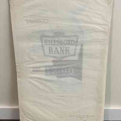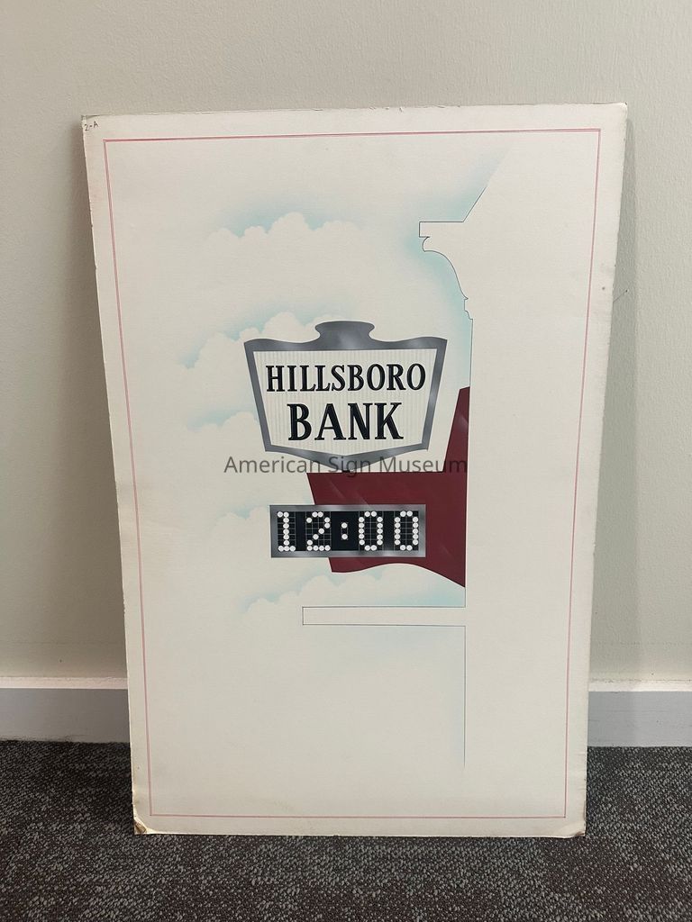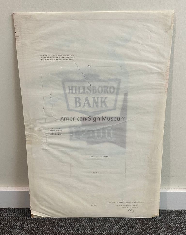 Airbrushed, hand-rendered 1960s era sign sketch reading Hillsboro Bank with an overlay of paper. Made by "Clement" Booth Yonka through Lackner Custom SignsArtwork Details