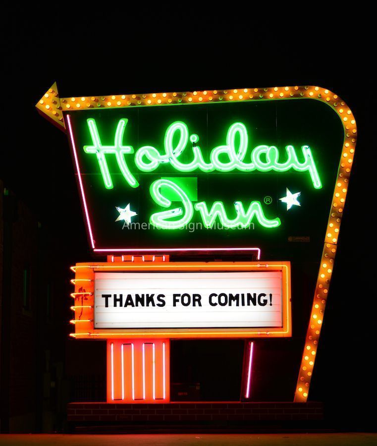 Known as the Great Sign, the Holiday Inn sign was once an icon of the American road trip—a true design landmark that dotted the nation’s highways and bi-ways. The sheer scale, bright yellow and orange lightbulb-lit arrow, and neon starburst topper were all intentionally designed to surely catch motorists’ eyes from the highway. It was the creation of Holiday Inn founder Kemmons Wilson, and later made/designed in 1954 by Cummings Company of Nashville, TN.