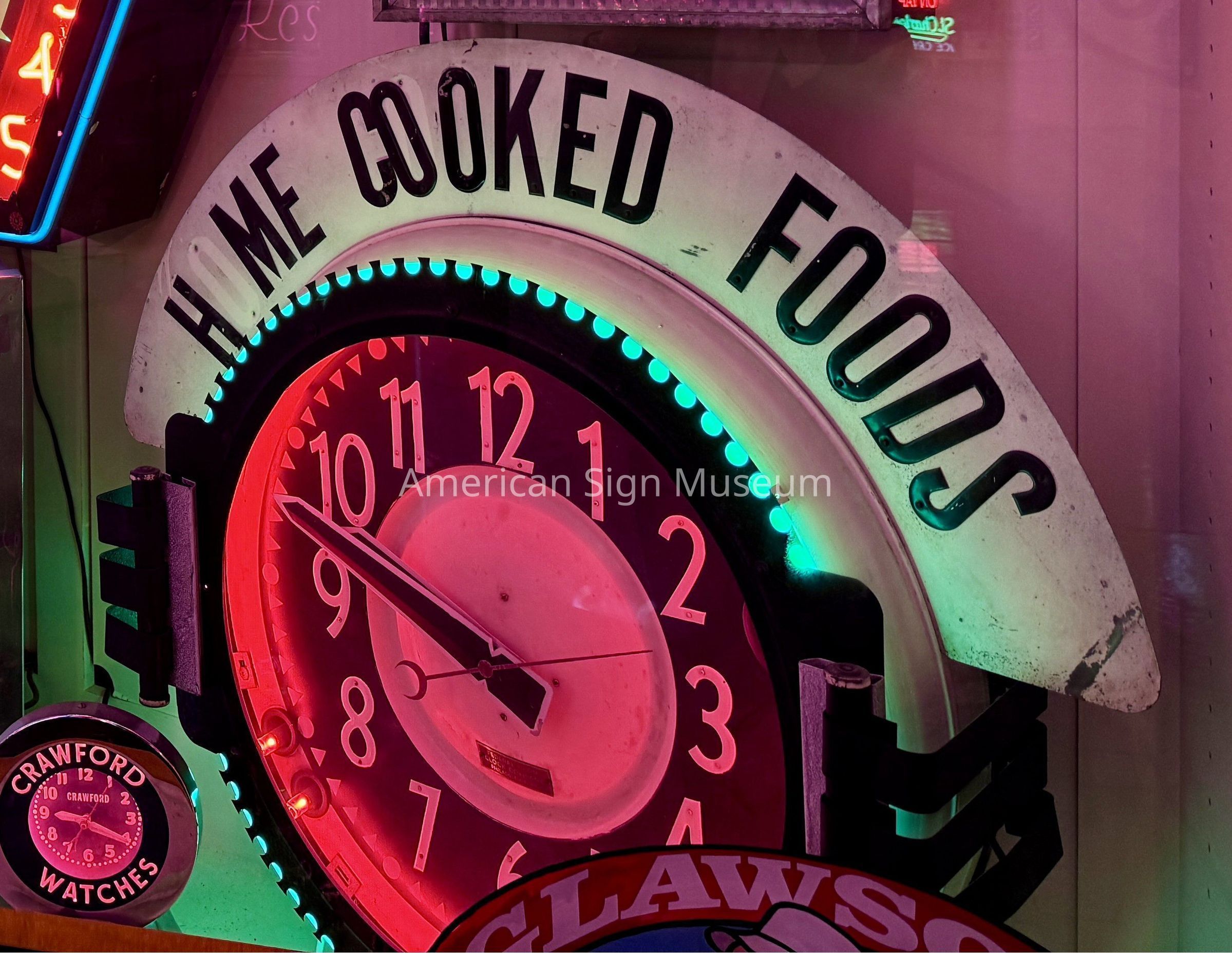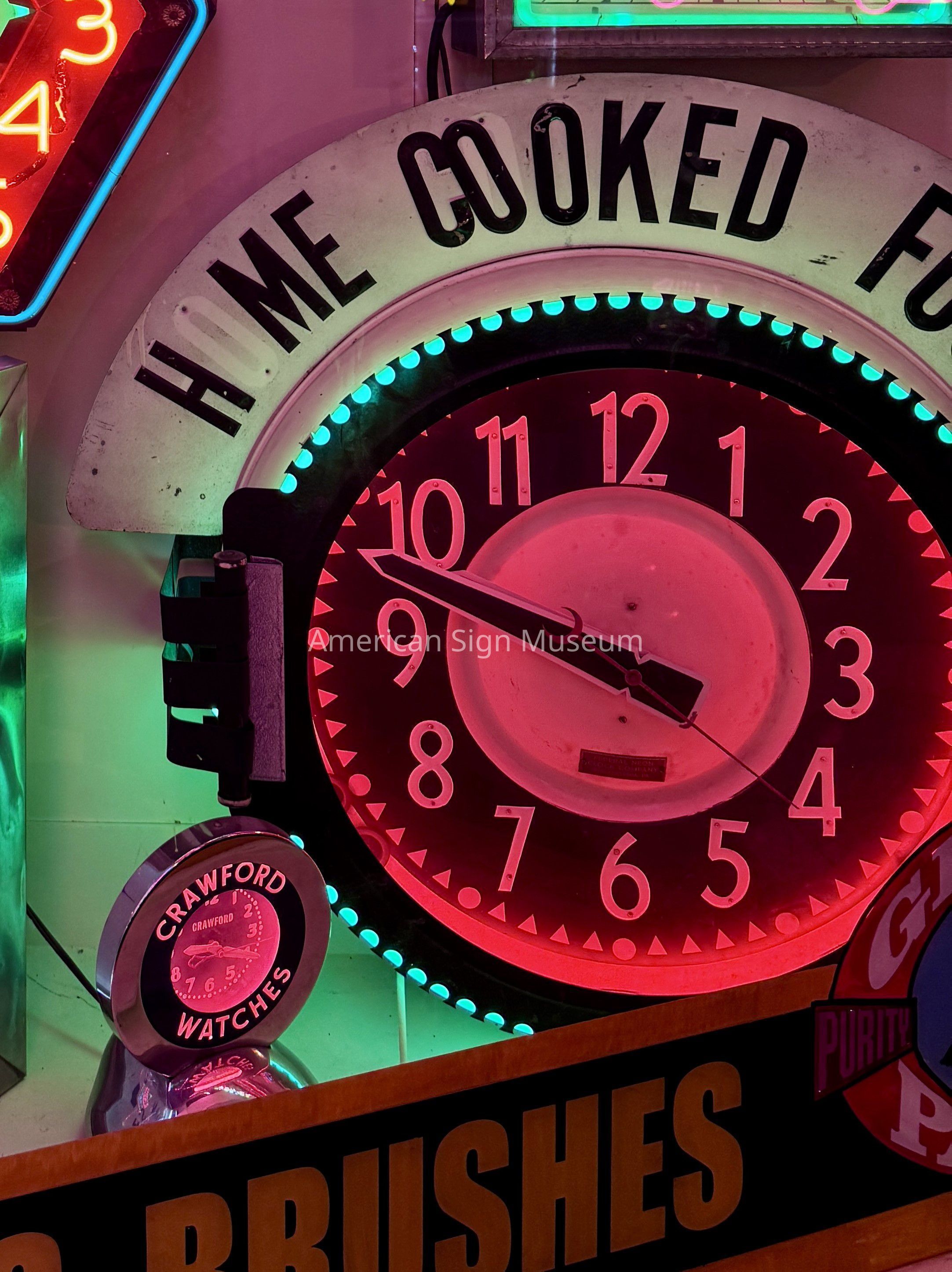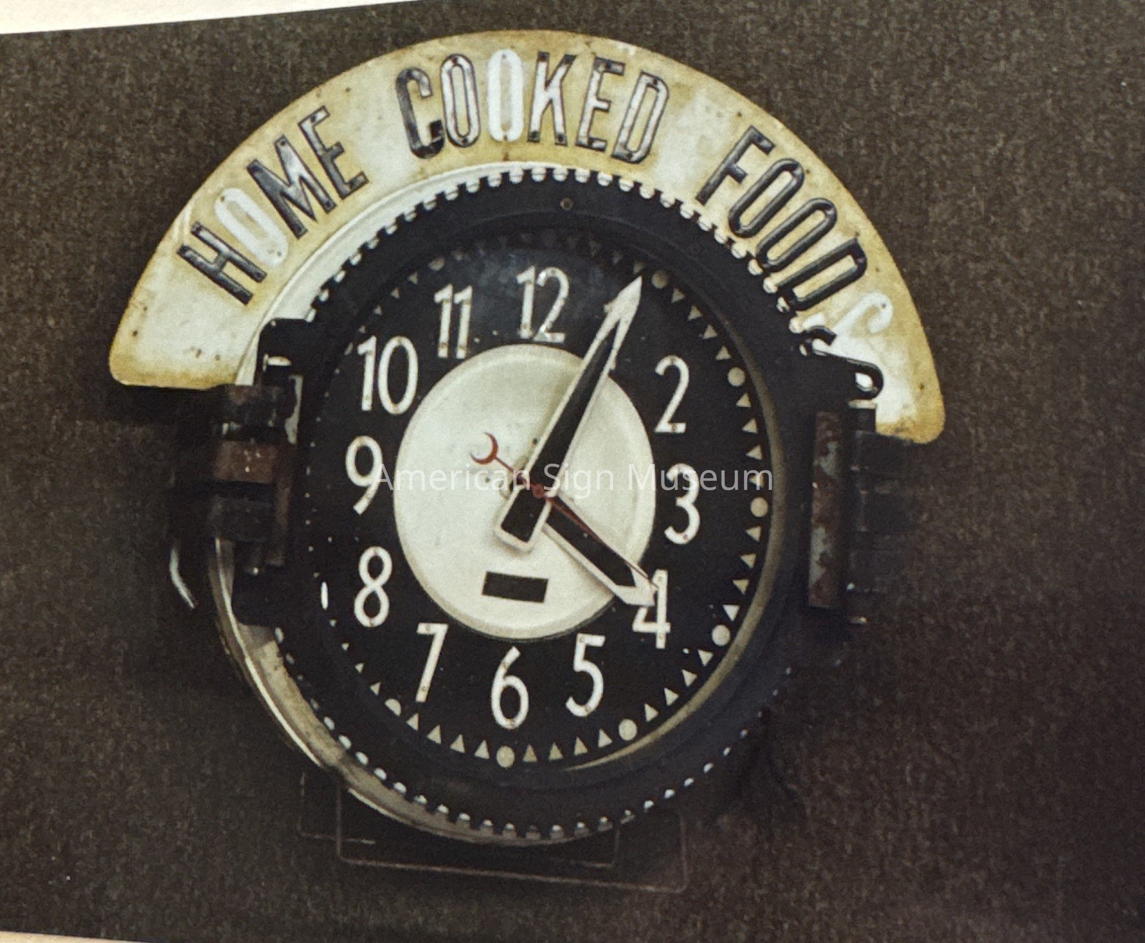 This 1930s neon clock was manufactured by Federal Neon Clock Company. It has two border twos: one exposed and the other recessed. There is also custom porcelain letters on the marquee that highlight the original restaurant's, "home cooking."Category