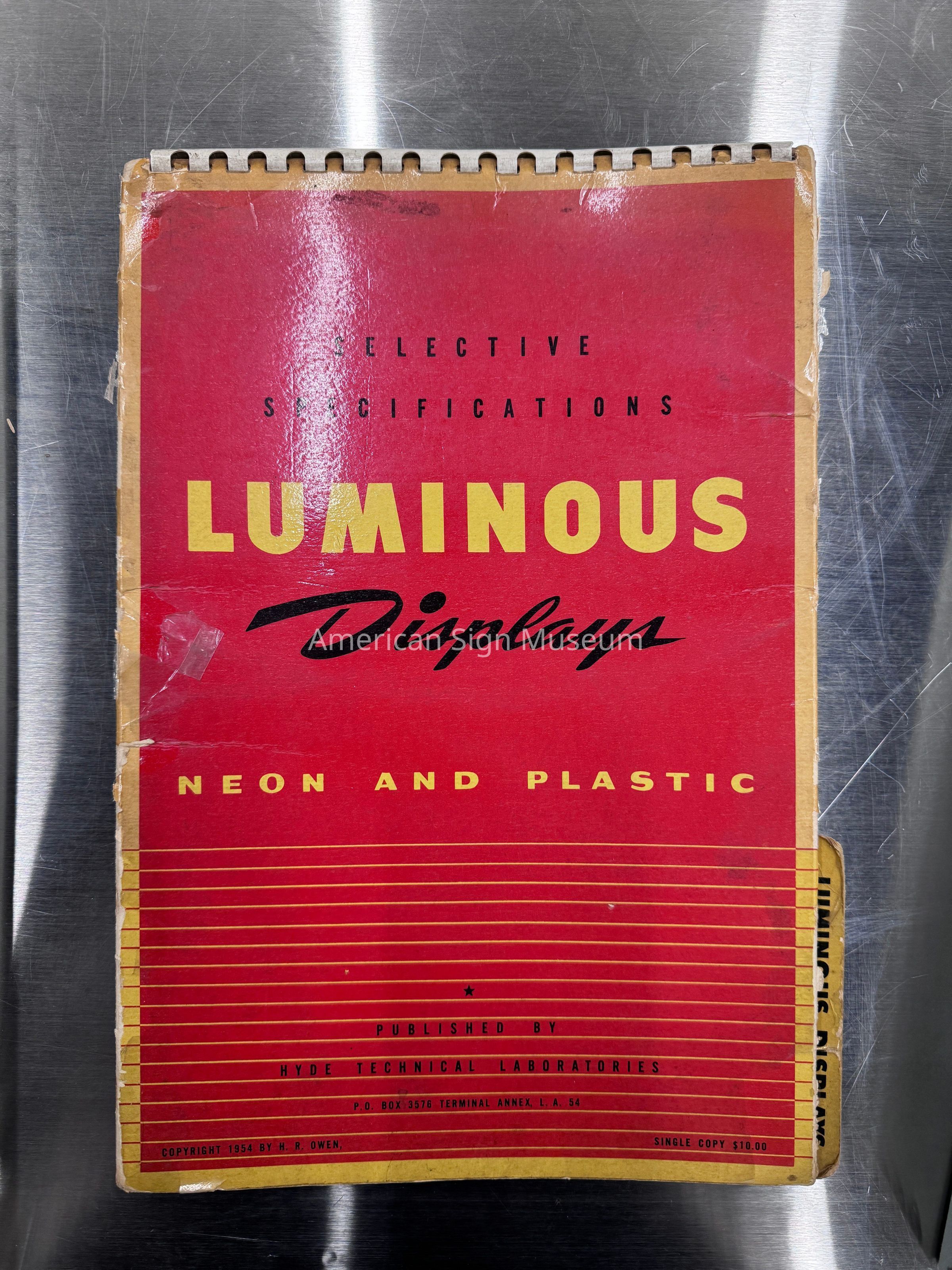Selective Specifications: Luminous Display - Neon and Plastic published by Hyde Technical Laboratories, Los Angeles, CA; 1954.Softbound, spiral bound inside three-panel fold-out cover, two-color cover; text only; 42 pagesCollection