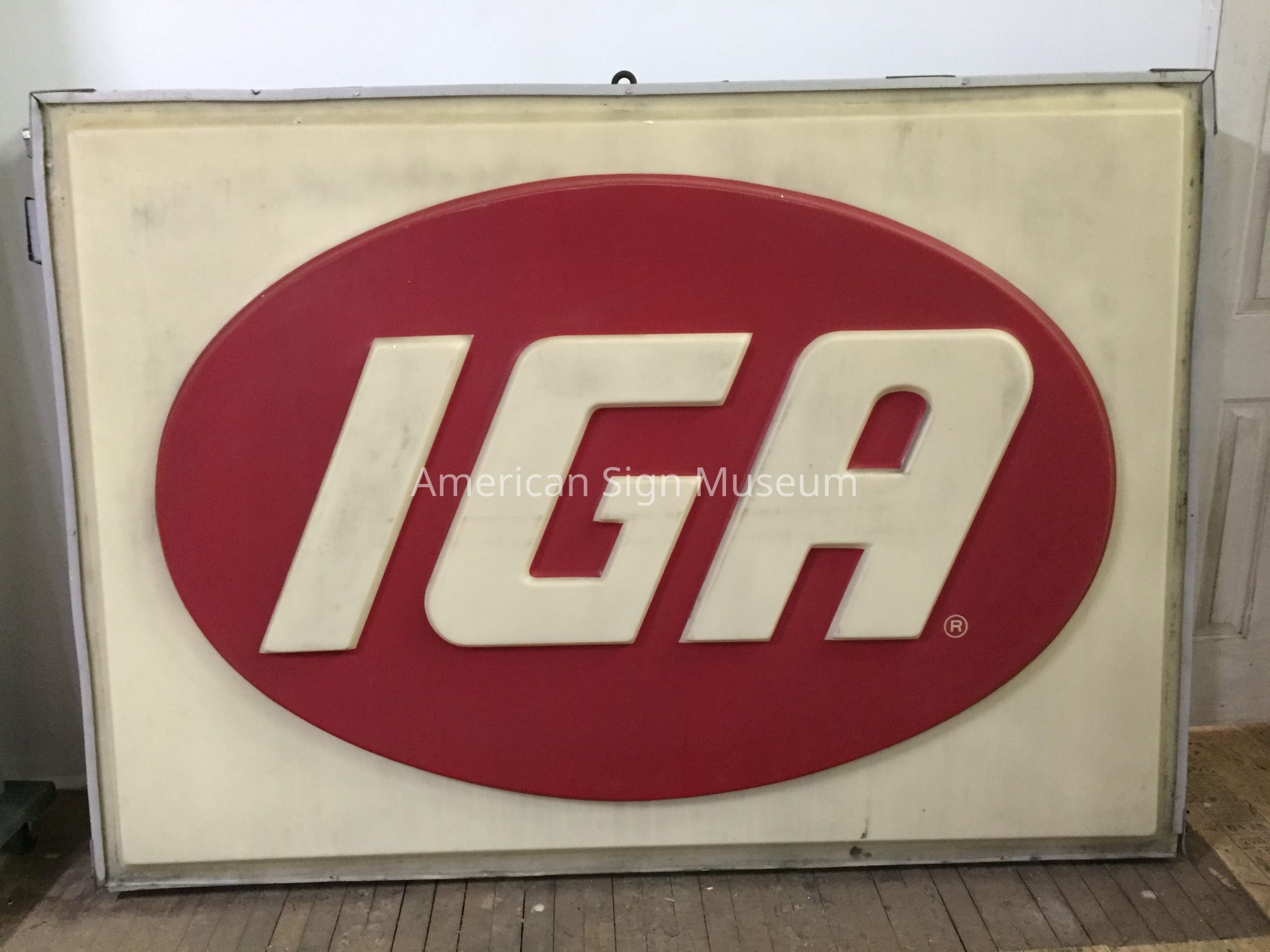 This is a single-faced, internally illuminated, pan plastic sign. It was one of two facia signs identifying an IGA store in Springboro, OH. Building was demolished in February, 2016.