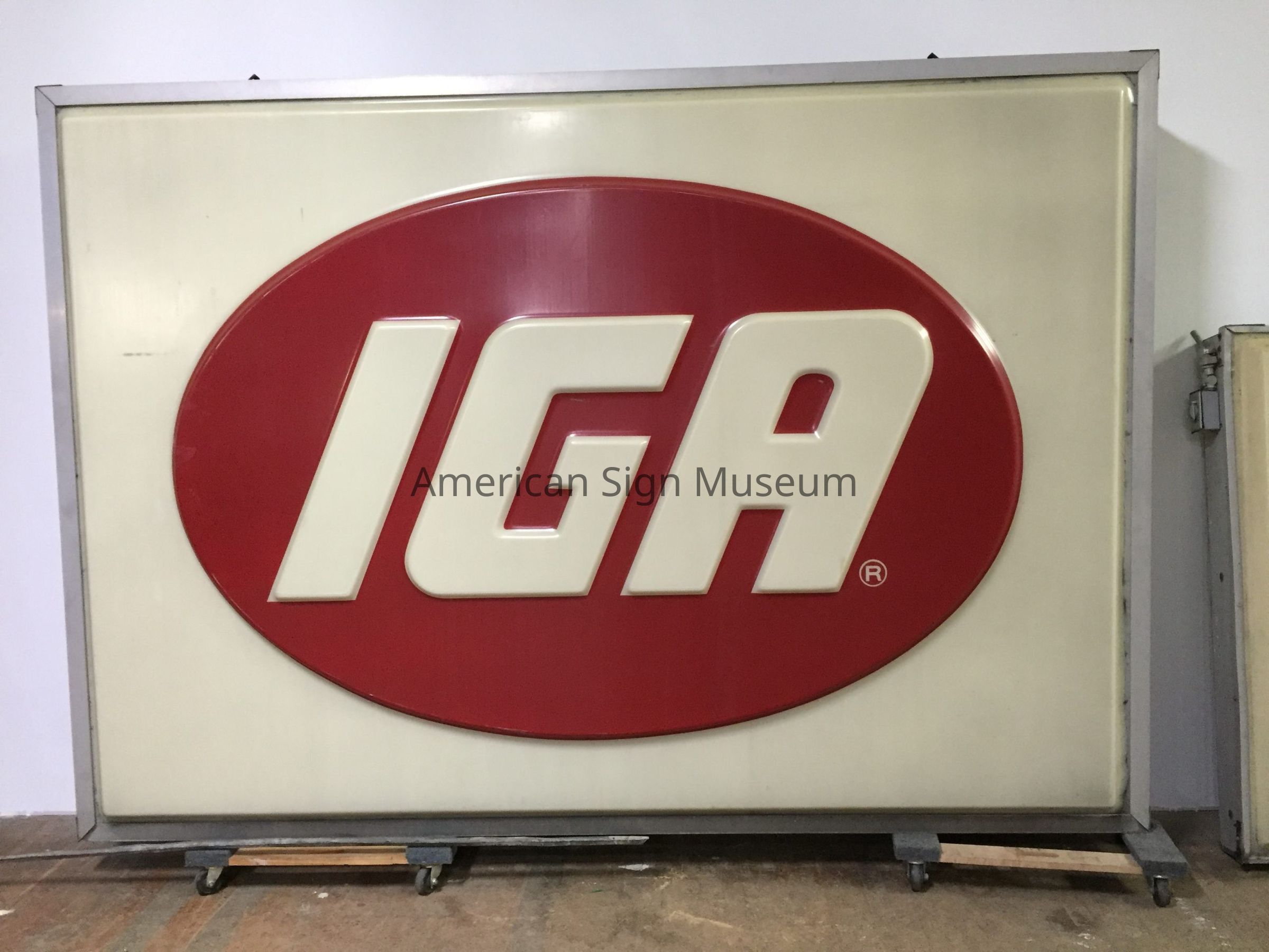 This is a single-faced, internally illuminated, pan plastic sign. It was one of two facia signs identifying an IGA store in Springboro, OH. Building was demolished in February, 2016.
