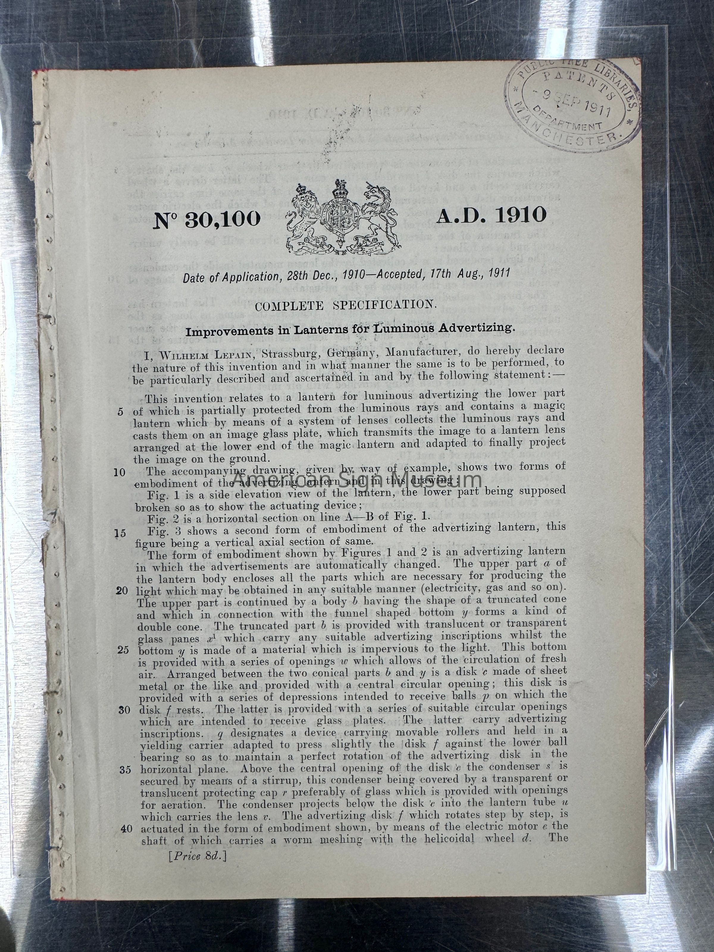 Improvements in Lanterns for Luminous Advertising by Wilhelm Lepain, Strassburg, Germany. Patent granted 8-17-1911. Three pages, plus two pages of illustration; black-and-shite. Pages appear to be torn from a hardbound book.Collection