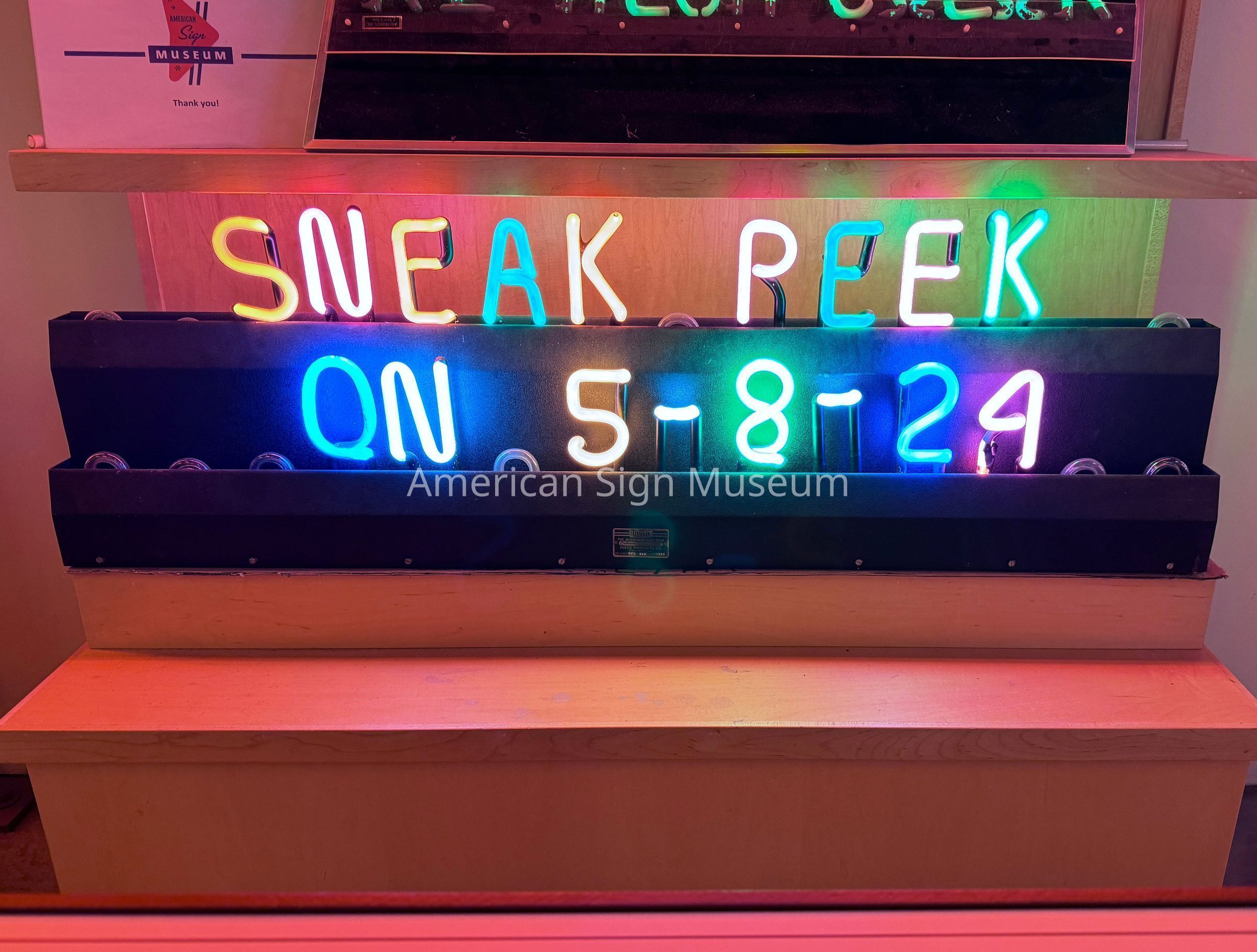 This is a changeable neon display from the early 1950s. Brass caps at the ends of each tube make the electrical connection to illuminate the individual letters. Sign was manufactured by INSCO Products Company, Piqua, OH. The sign was available in several different sizes in both single-and double-row formats.Collection