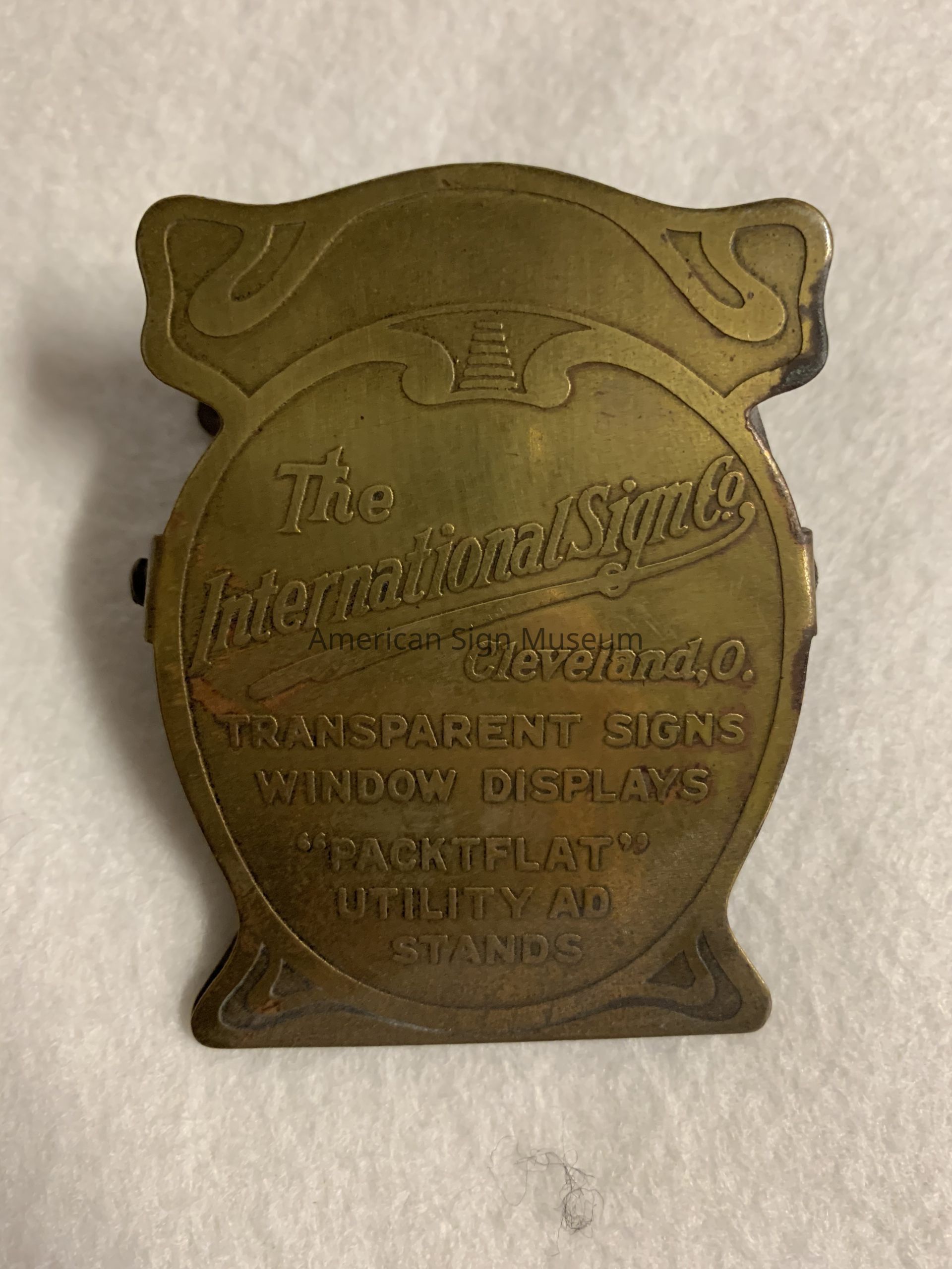 Solid brass clip for The International Sign Co., Cleveland, OH, manufacturers of transparent signs and window displays. Clip states, "The International Sign Co. -- Cleveland, O.-- Transparent Signs Window Displays -- "PACKTFLAT" Utility Ad Stands."Collection