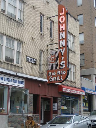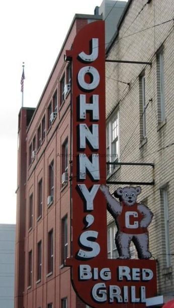 A double-faced, 21-foot tall, die-cut, painted sheet metal neon sign that was installed on the exterior of Johnny's Big Red Grill in 1949, in Ithaca, NY. The restaurant was well-loved Collegetown landmark, popular with the Cornell crowd, as it had opened back in 1919 as a coffee shop first. Later it became an eatery and was run by John Petrillose ST., and his wife, Ruth.