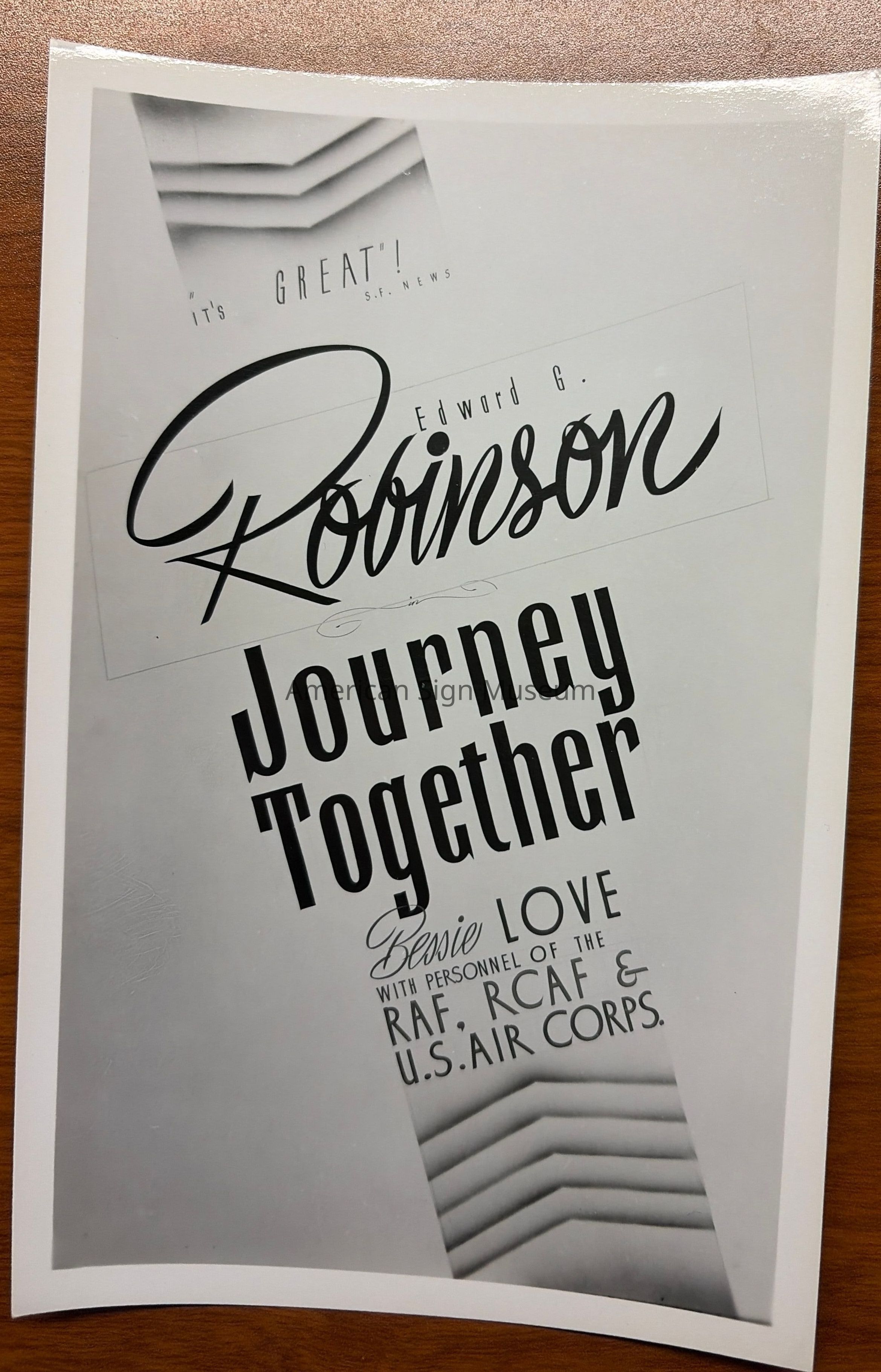 Black and white photograph of a show card reading " 'It's GREAT' S.F. News Edward G. Robinson Journey Together Bessie Love with Personnel of the RAF, RCAF, & U.S. Air Corps.". Made by Don Sturdivant.Collection