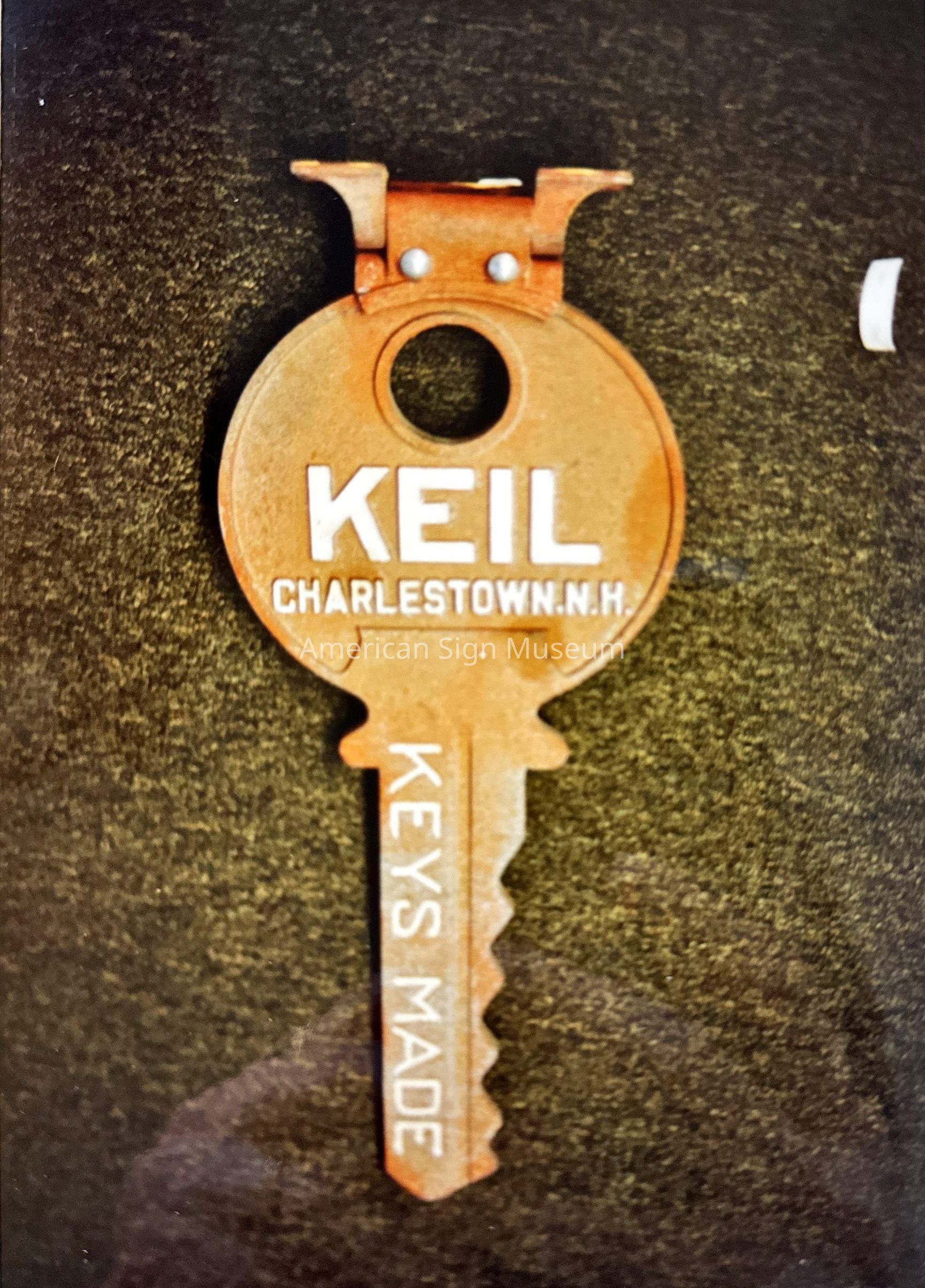 Cast metal, possibly aluminum, sign is in the shape of a three-dimensional key and is designed to hang down from the hinged bracket. Copy reads, "Charlestown, N.H." and "Keys Made."Collection