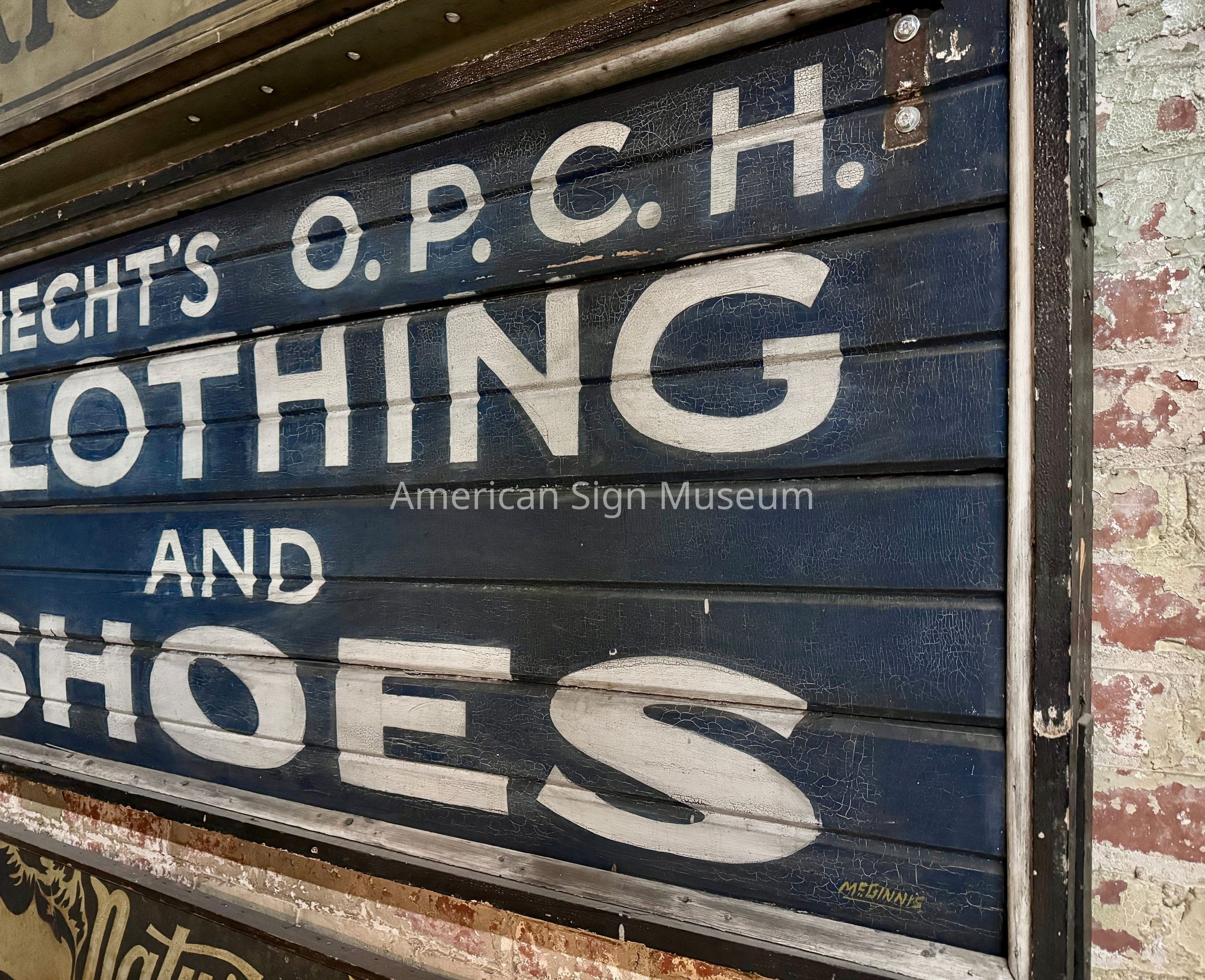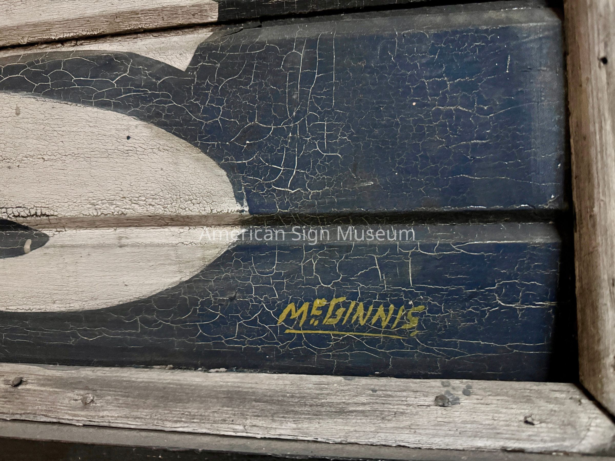 This hand-lettered, double-faced sign originally projected from the facade of the clothing and shoe store. The face is made from tongue-and-groove siding such as what would have been used on the exterior of a house. The sign may have even matched the siding of its building. It has a name signed in the lower right corner, McGinnis.Collection