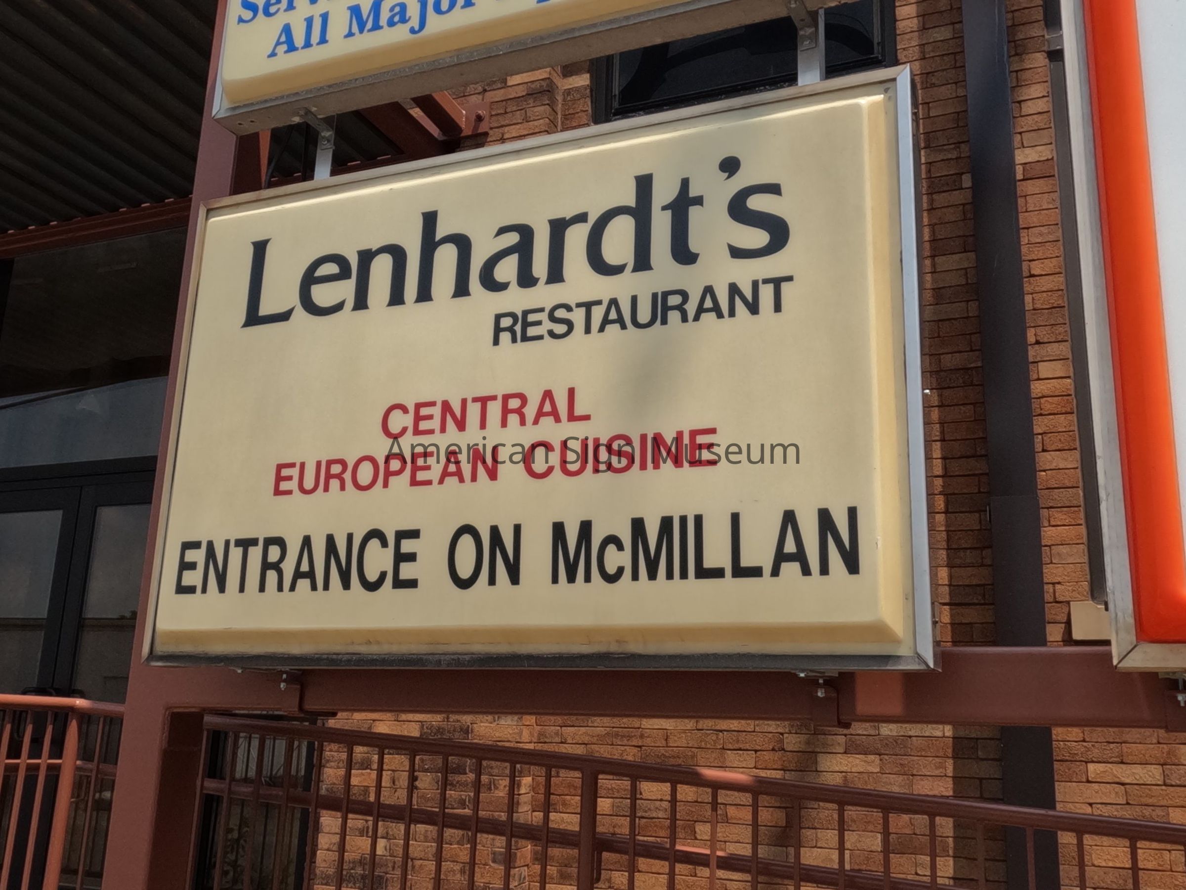 A double-faced internally illuminated plastic sign. Once a Cincinnati icon for German and Hungarian food, Lenhardt’s was open in the Clifton Heights neighborhood from 1955 to 2013. This internally-illuminated, plastic sign is likely original to the restaurant’s mid-century opening. In 2014, the Lenhardt’s family donated the sign to the Museum. In 2023, this sign along with all of the ASM’s other plastic signs were retrofitted to LED lighting, which is now the industry-standard for lighting signs.