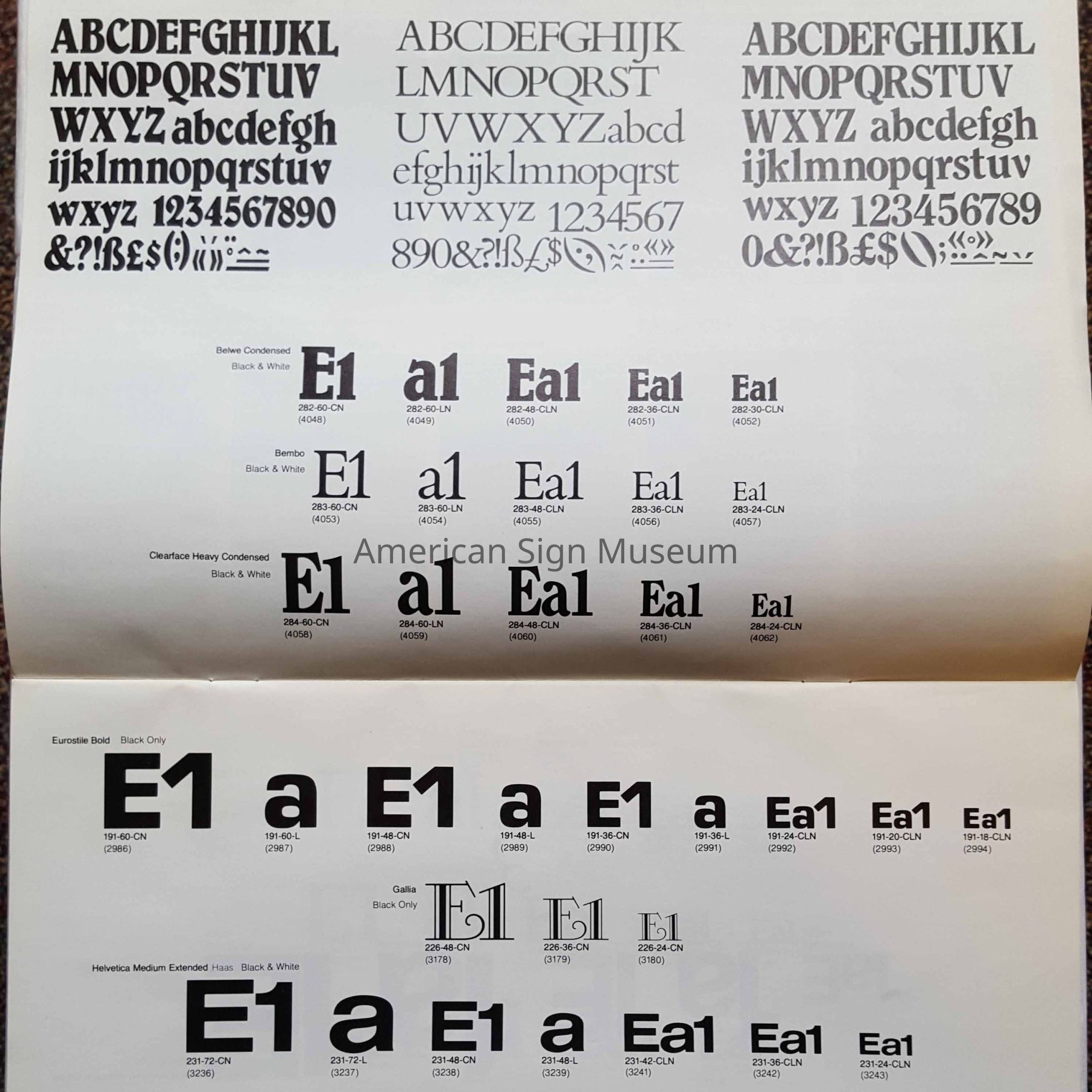 A catalog with typefaces, font sizes, colors and many other design components to create a sign.(See also 2015.0024.0001-0034)Collection