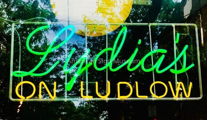 Single-faced skeleton neon sign made in a 1950s-style for Lydia's on Ludlow in Cincinnati. Lydia's opened in 2006 in the Clifton Gaslight district at 329 Ludlow Ave and closed in February of 2020 in part due to a street-wide recession that started when IGA left in combination with Lydia being exhausted from the daily running of the restaurant. They were known as one of Cincinnati's only green cafes and served homemade soups, salads, and sandwiches in combination with coffee, tea, and a variety of cocktails. They were also well known for their live music throughout the week as well as the apothecary and retail store.
