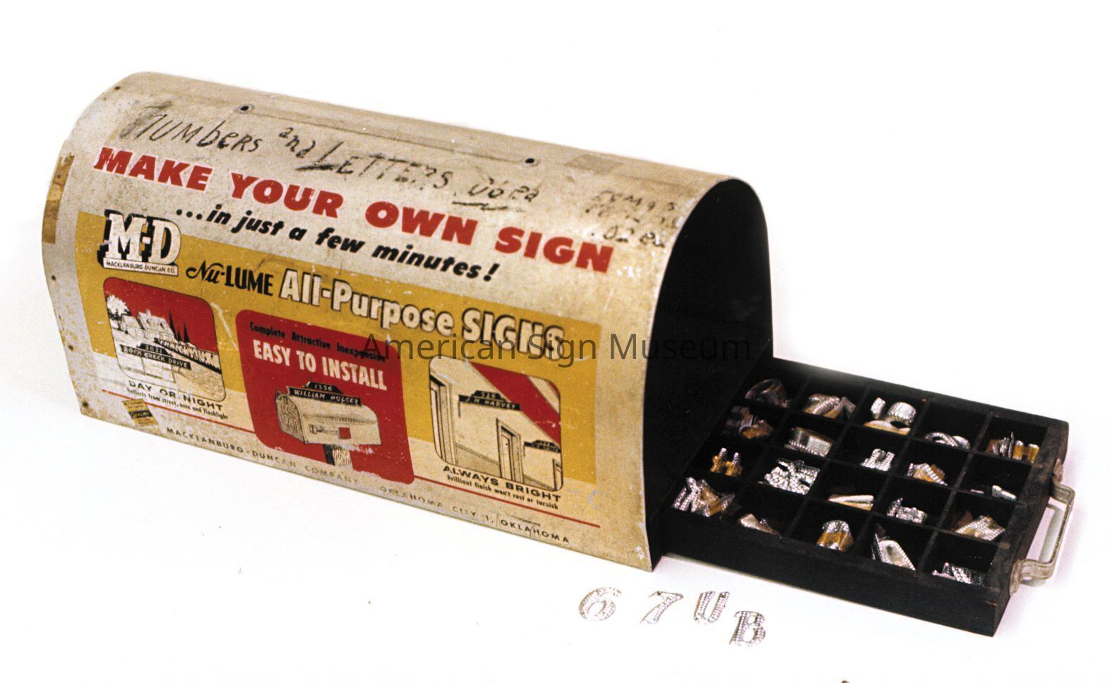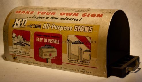 "Make Your Own Sign" mailbox sign kit was originally a point-of-purchase display for Nu-Lume All-Purpose Signs. and was manufactured by the Macklanburg-Duncan Co., Oklamahoma City 1, OK. The clever display consisted of reflective plastic letters stored in a pull-out tray, and frames for use as projecting wall signs, mailbox signs or stick-in-the-ground signs, indicating name and address or room number. Copy and graphics are screen-printed in four colors. The letters and numbers were originally priced at 10 cents per letter or number.Collection