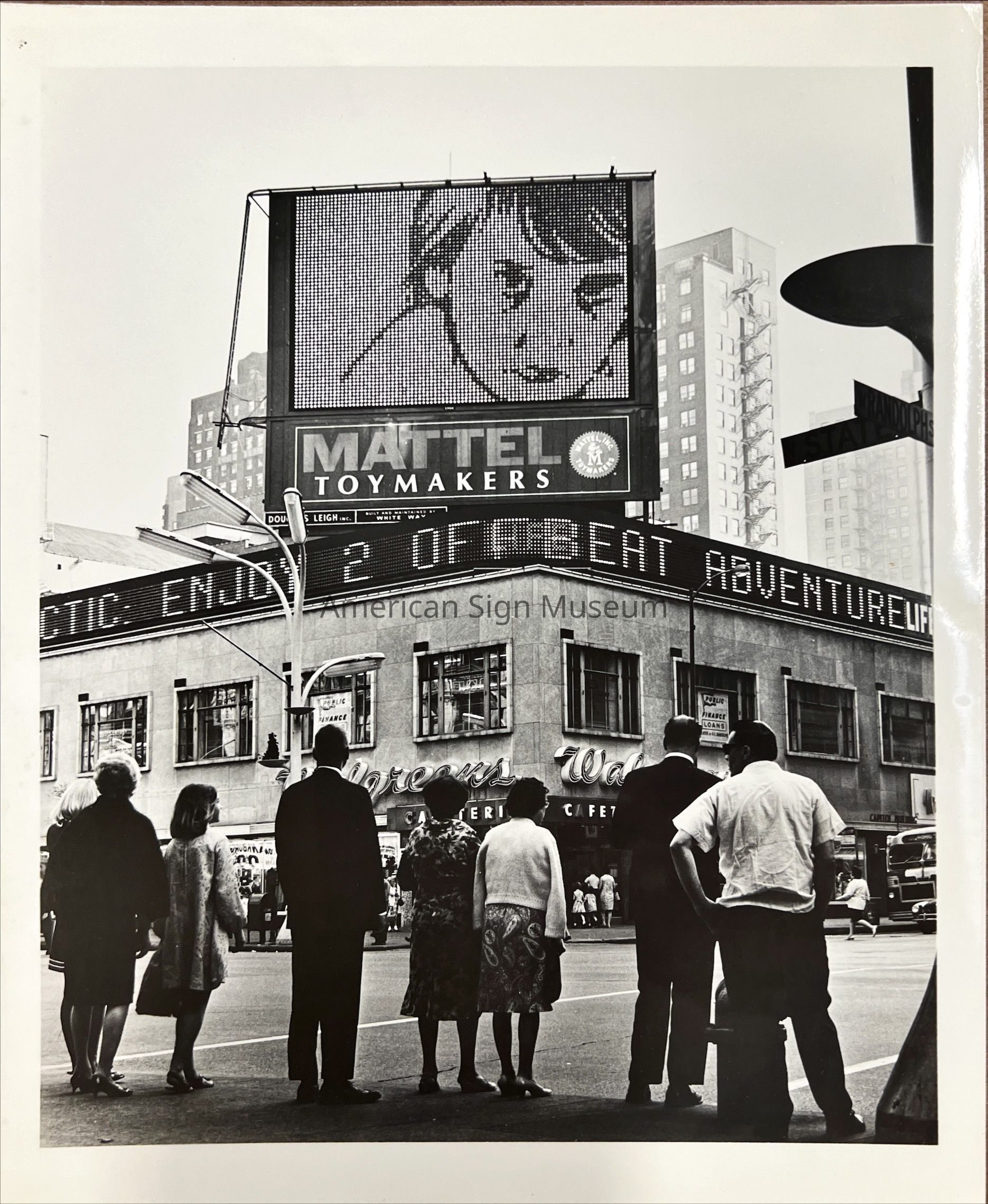 B&W photograph of Mattel Toymakers Epok sign at State and Randolph St.