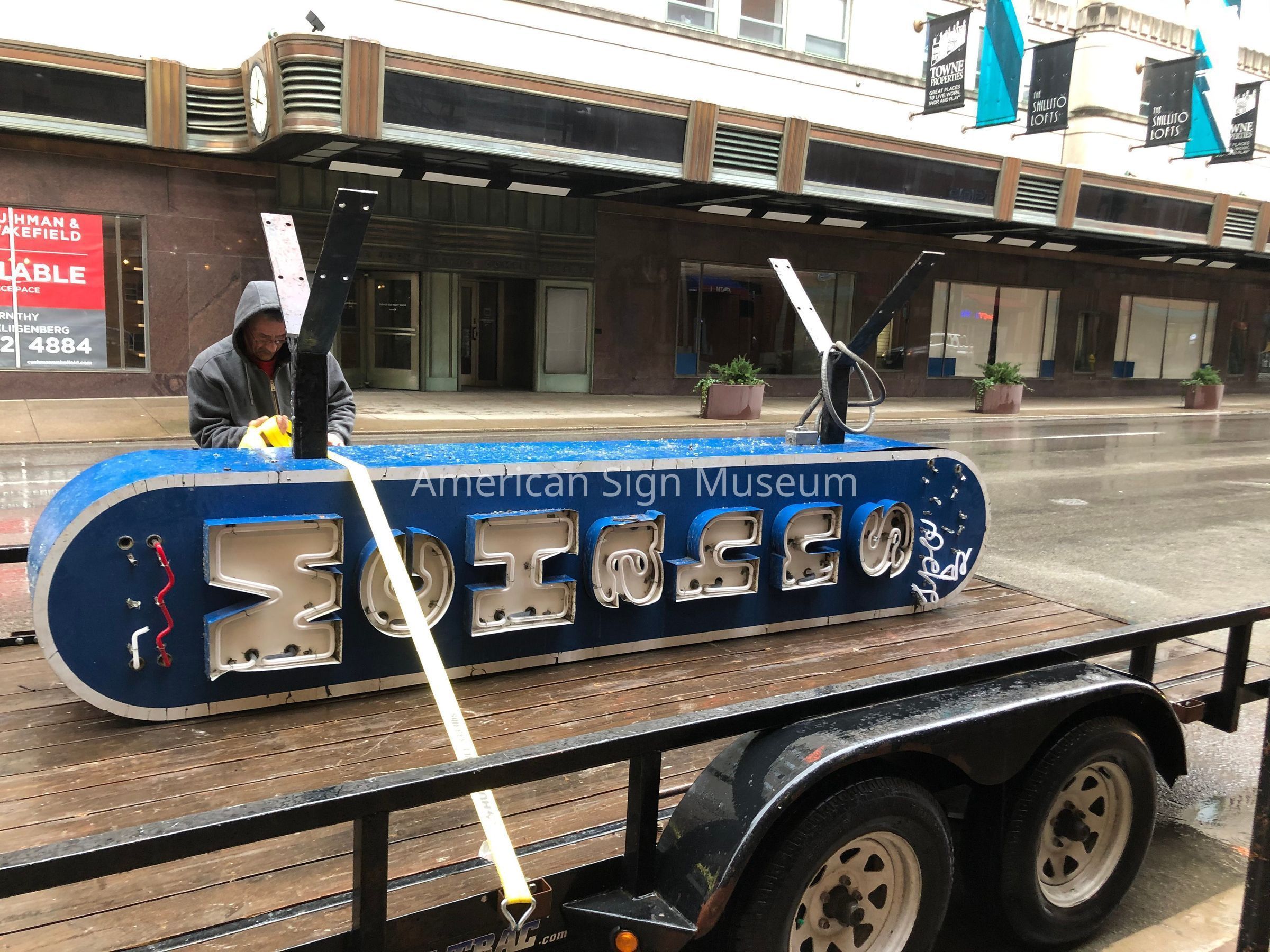 Blue-painted aluminum makes up the sign’s cabinet, and the wording is created with open-face channel letters. In this example of open-channel, the empty space within the three-dimensional block lettering is fitted with exposed neon tubing that illuminates the letters spelling the name of the business.