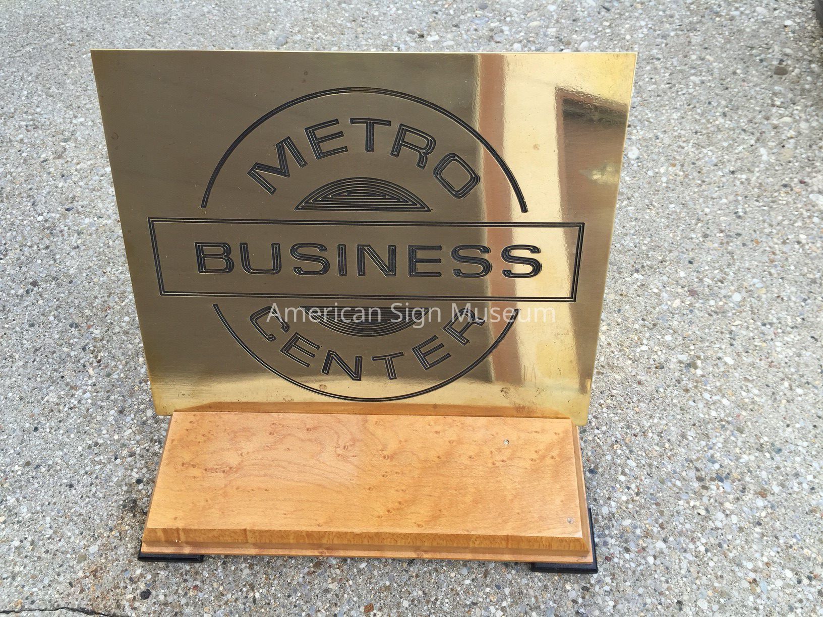 Salesman sample is routed brass and reads, "Metro Business Center" mounted on a wood base.