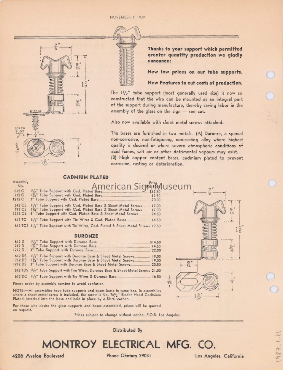 Double-sided illustrated price sheet for Montroy Electrical Mfg. Co.Collection