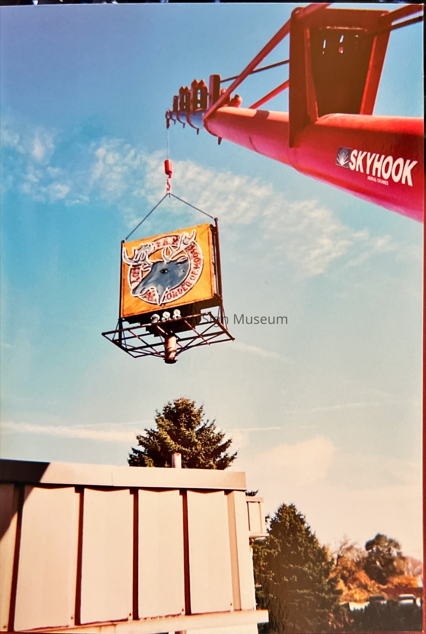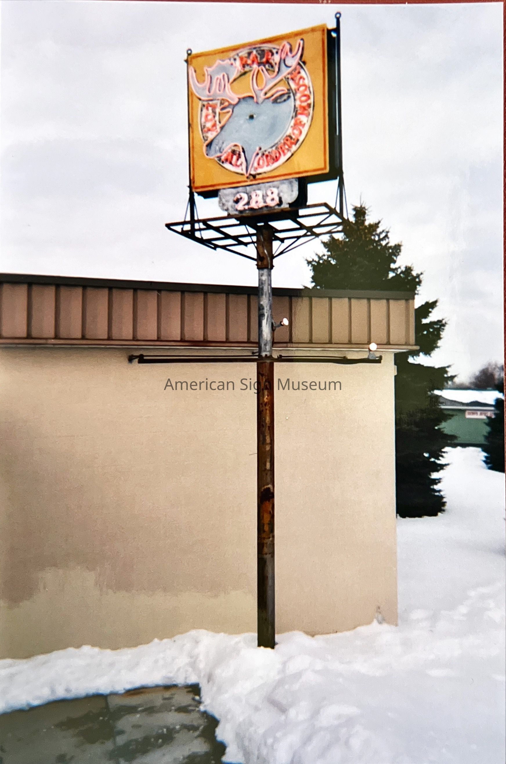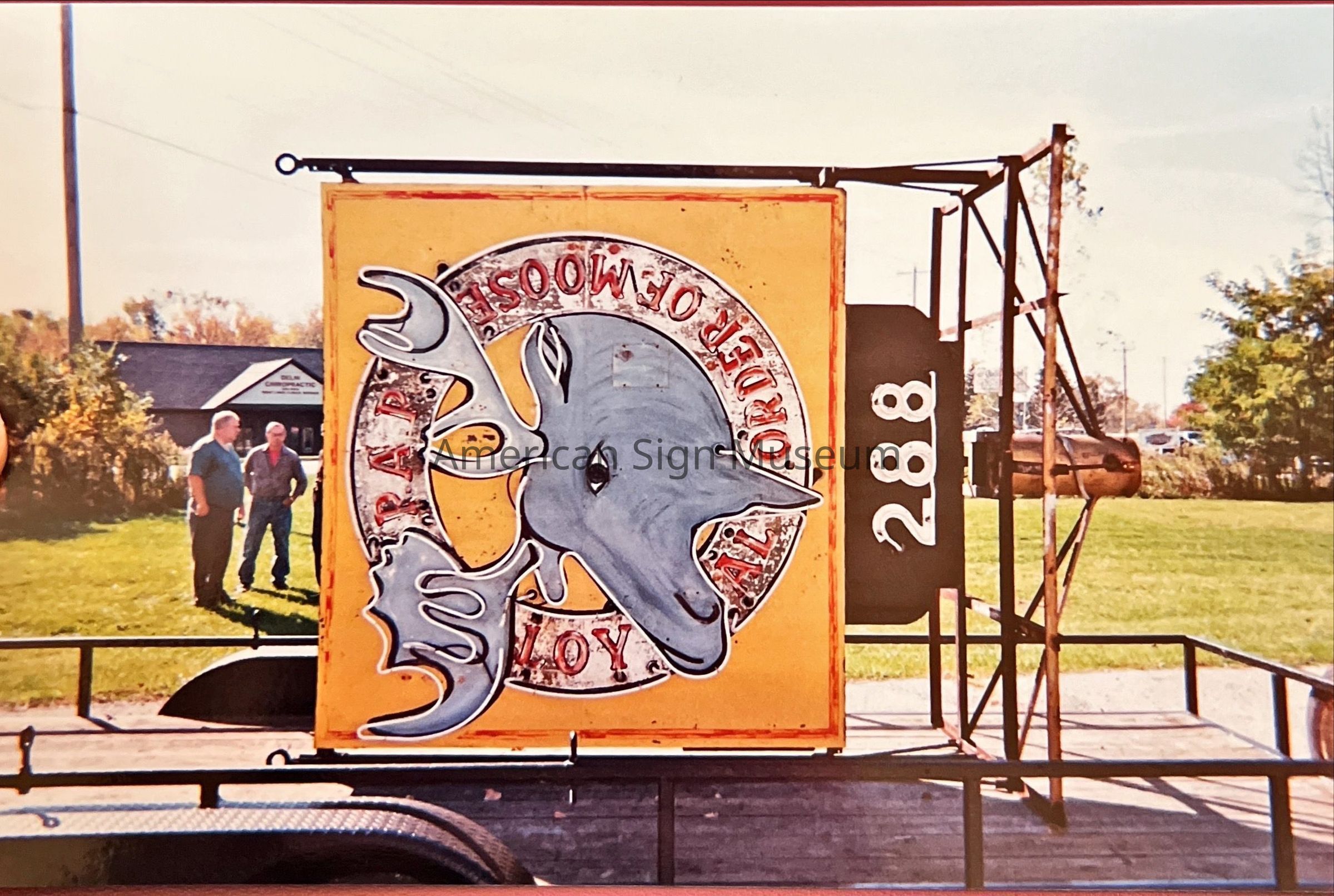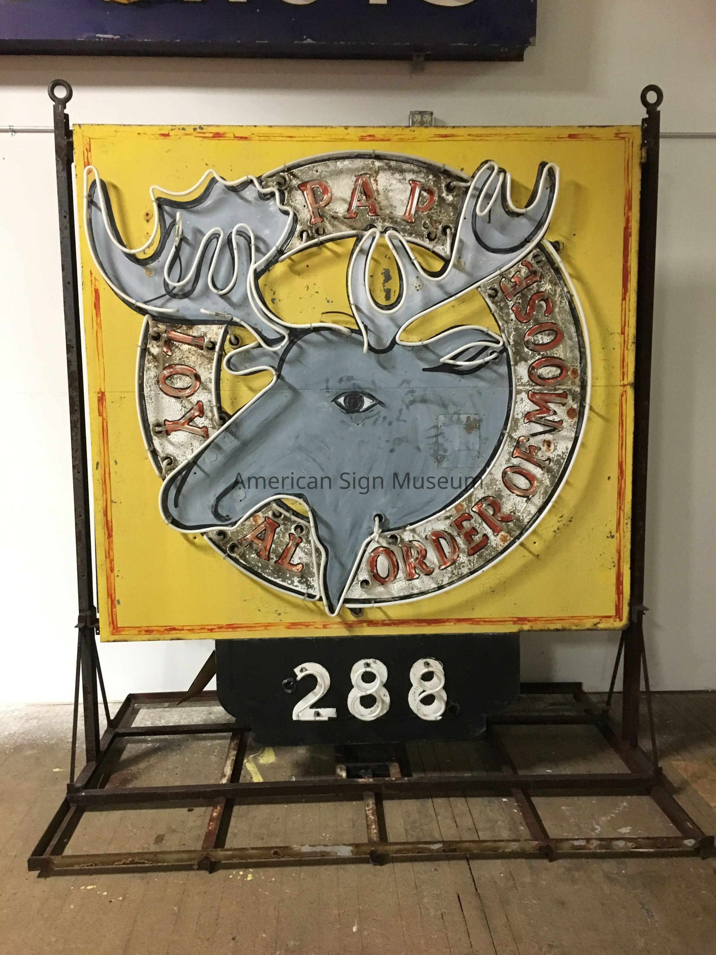 A double-faced, painted sheet metal and neon sign. It was originally pole-mounted and includes angle-iron, "maintenance platform."Collection