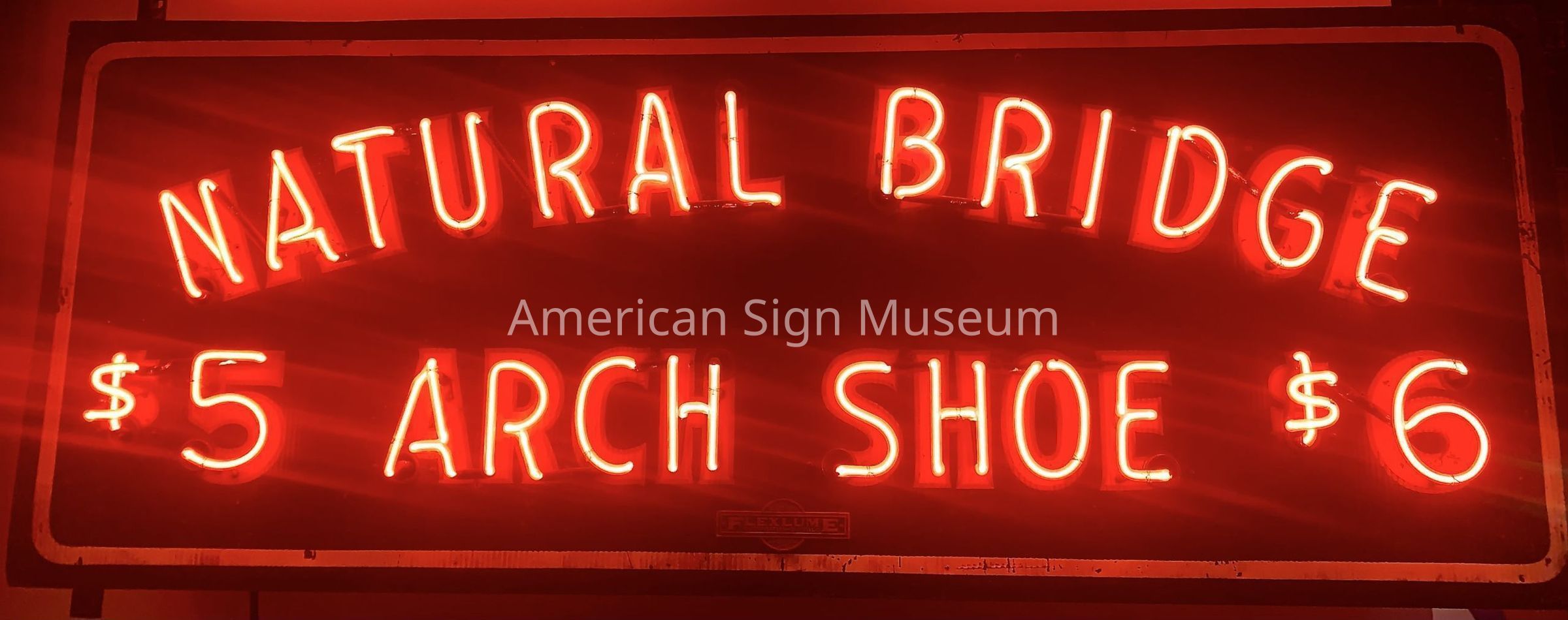 "Natural Bridge Arch Shoes" is double-faced, ripple tin neon production sign.