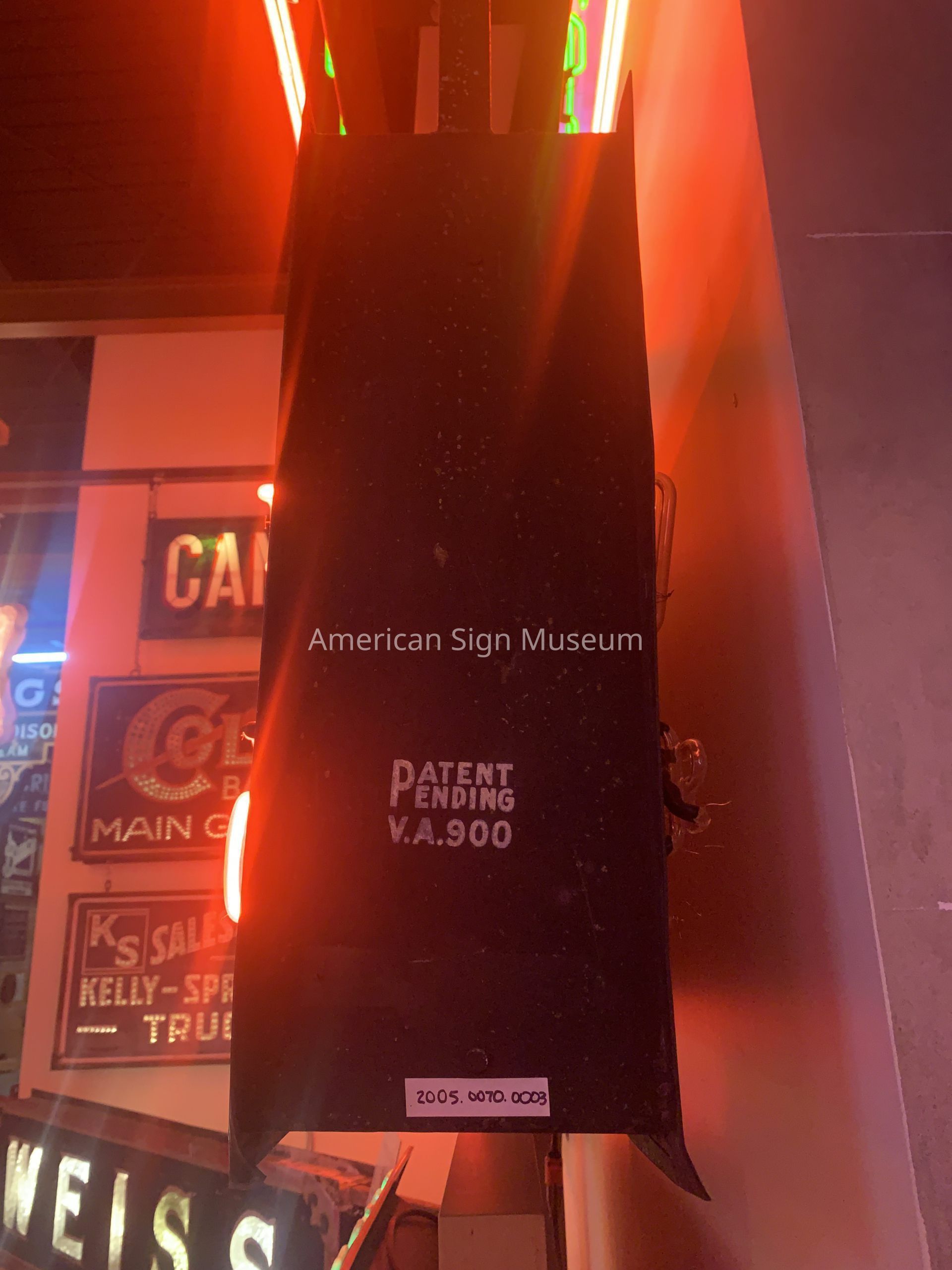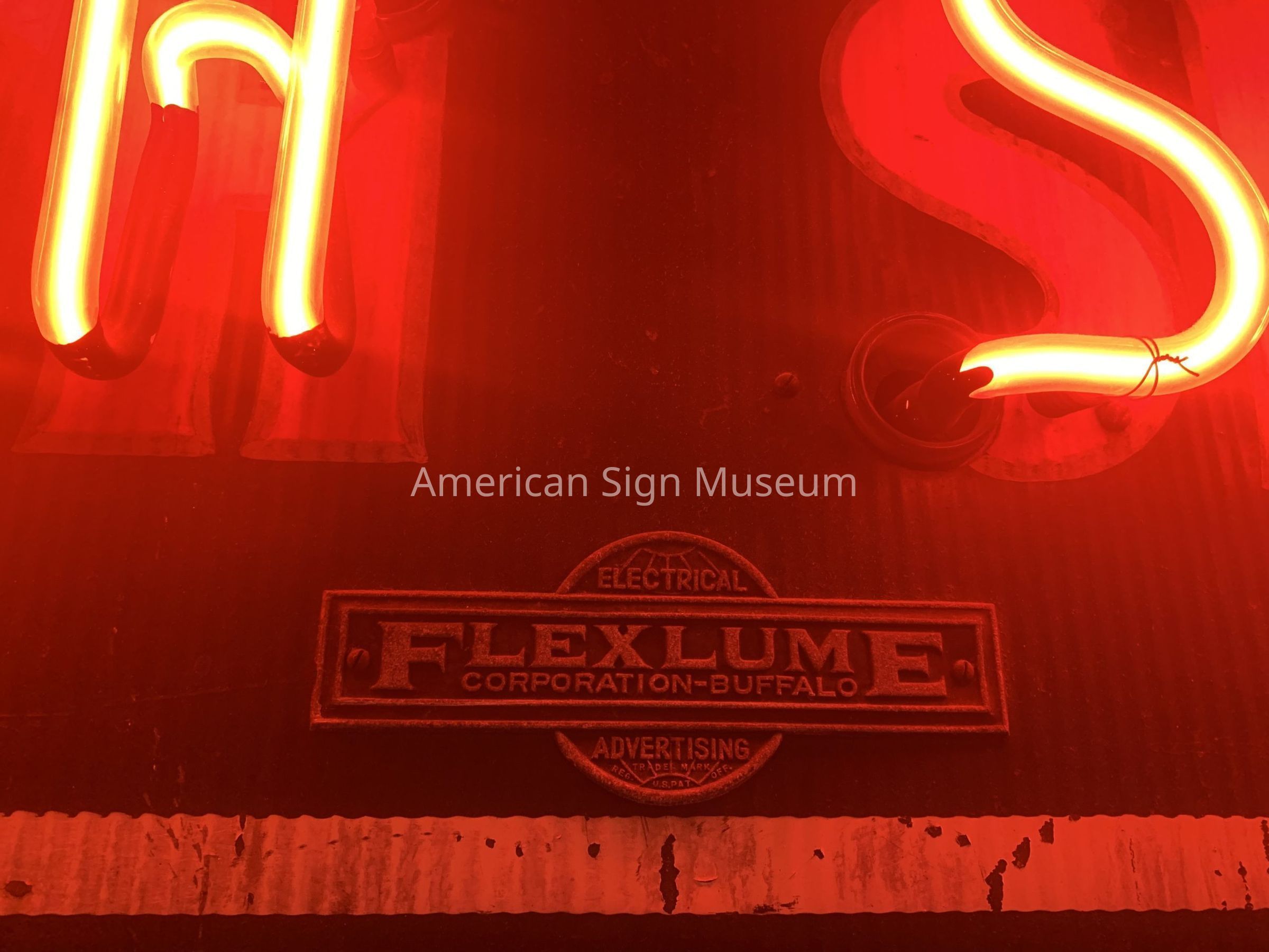 Sign as well as a large inventory of sign components were moved from the original Flexlume Sign Corp. factory in Buffalo, NY, to Flexlume's current location at 1464 Main St. in downtown Buffalo. Paddy Rowell's father, F.A. Rowell, acquired the physical assests of the production sign company in 1945 at auction. The inventory remained virtually undisturbed until the 1990s when sign collectors became aware of Flexlume's history - particularly with regard to opal glass letter signs. The museum became aware of the Flexlume collection in 2000 and contacted Paddy Rowell to arrange a visit. The visit prompted the donation of the museum's collection of Flexlume items over the course of the next several years.Collection