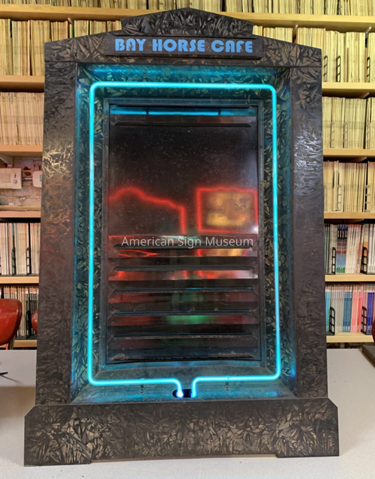 The Bay Horse Cafe is one of only two signs of this type the Museum collections features. The second sign has a menu board in the middle and was produced by Radiart Corporation in Cleveland, OH.
