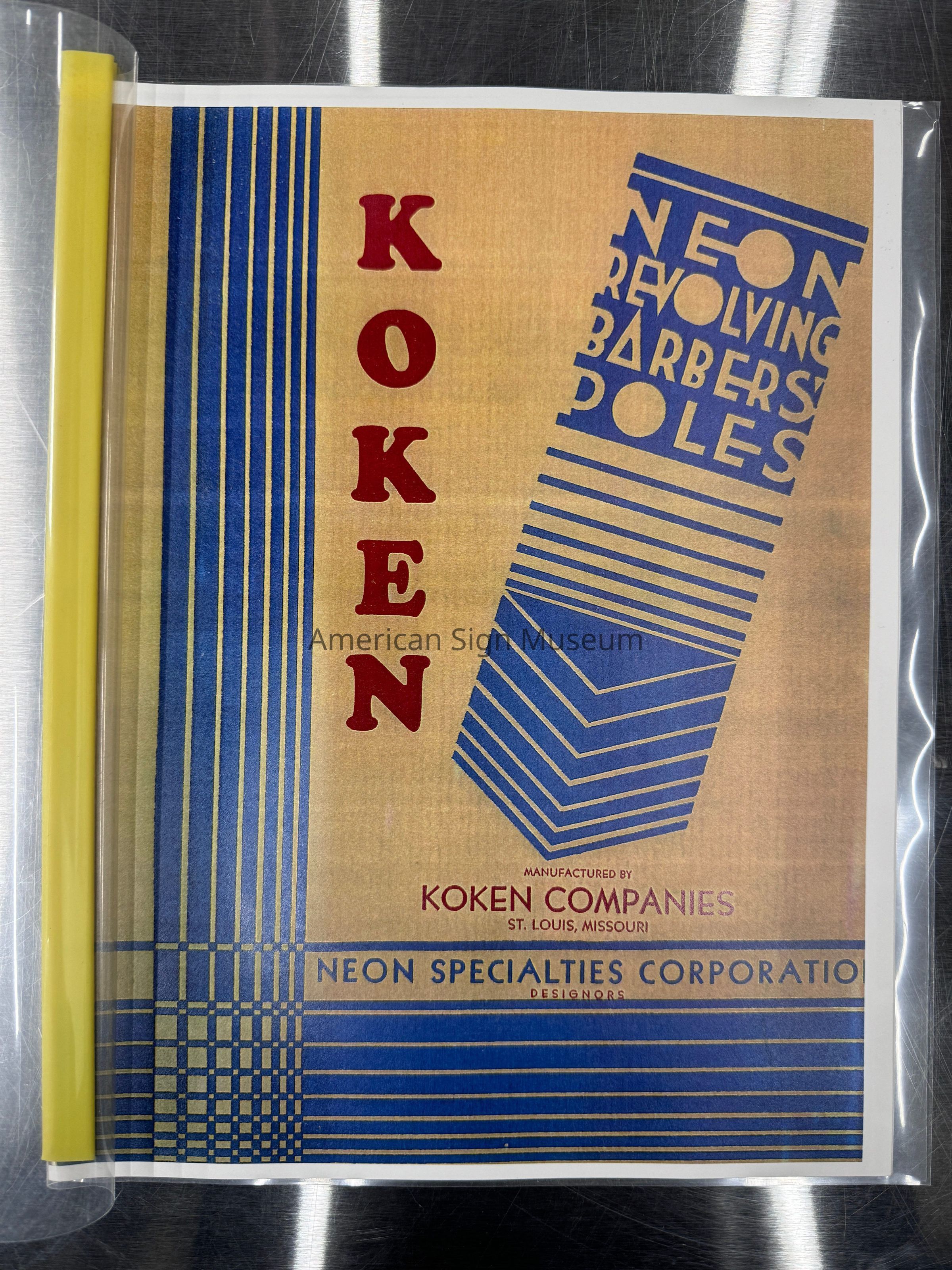 Koken Neon Barber Pole catalog is a reproduction of a 1931 catalog. Barber poles are designed by Neon Specialties Corp., Oakland, CA; manufactured by Koken Companies, St. Louis, MO. 20 pages, four-color in plastic sleeve.Collection