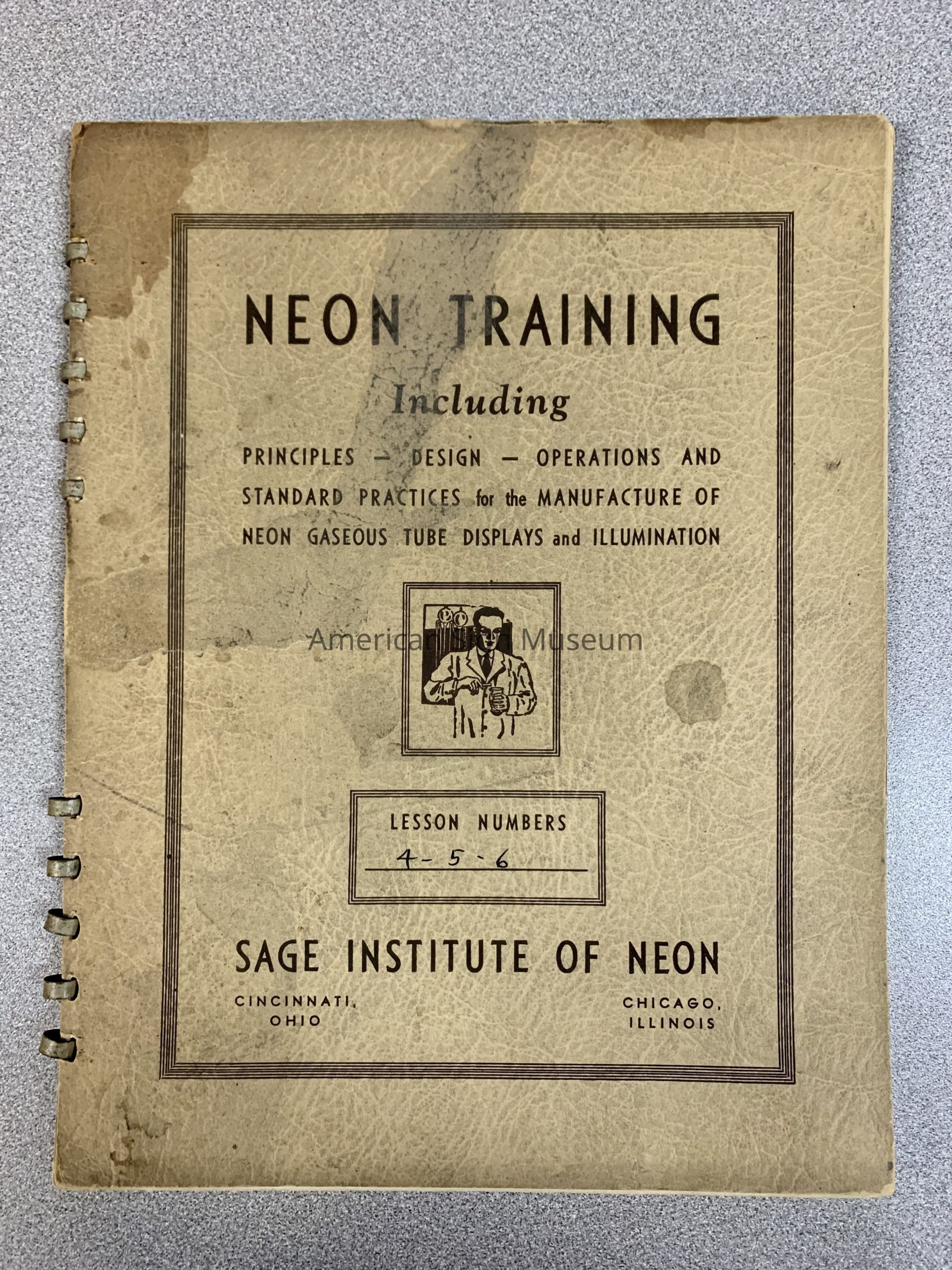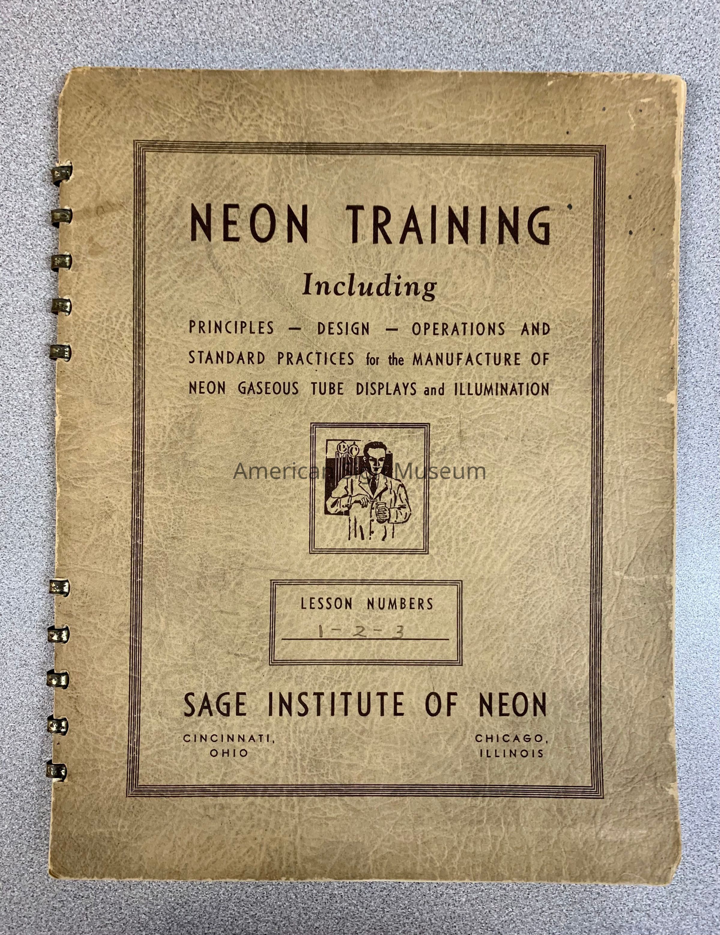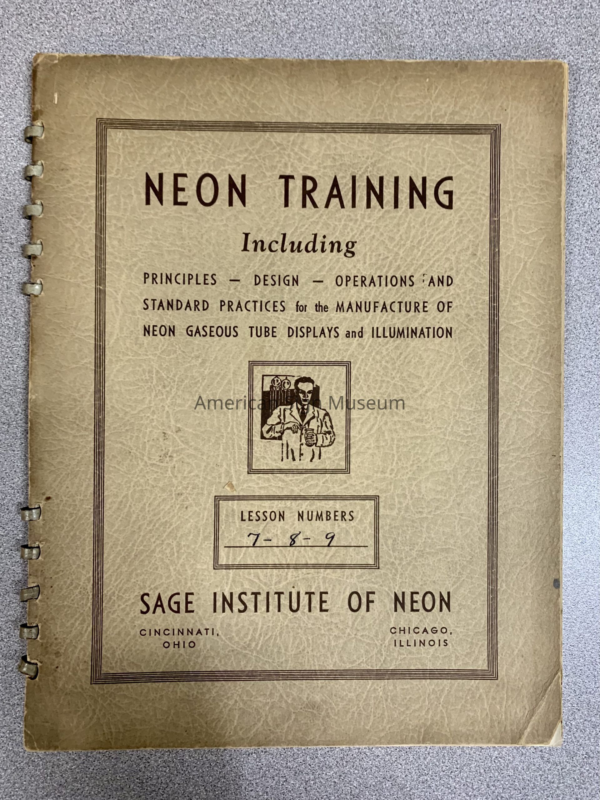 Set of three volumes of "Neon Training" manuals from the Sage Institute of Neon, Cincinnati, OH and Chicago, IL. Each cover reads, "Lesson Numbers" with blanks to fill in: First volume has penciled "1-2-3;" next has "4-5-6;" and third has "7-8-9." Spiral bound.Collection
