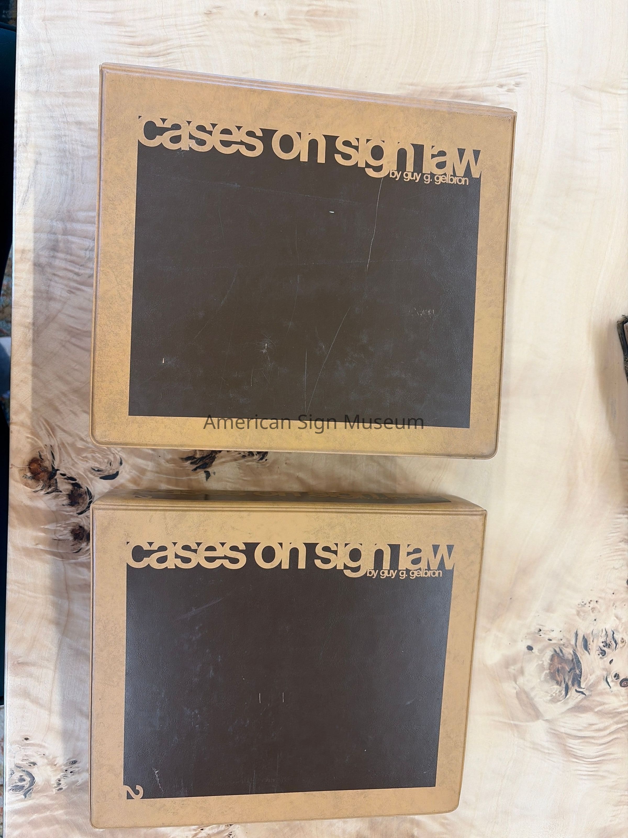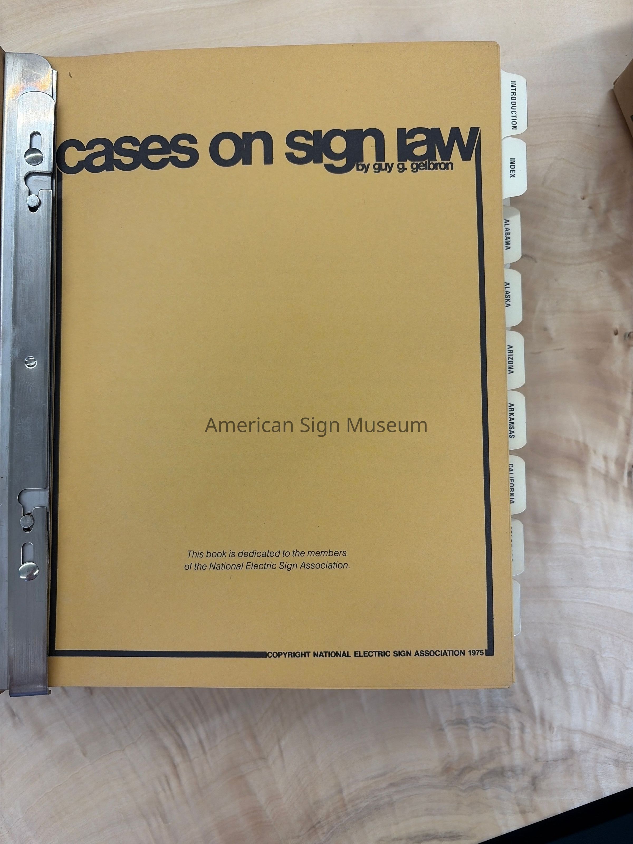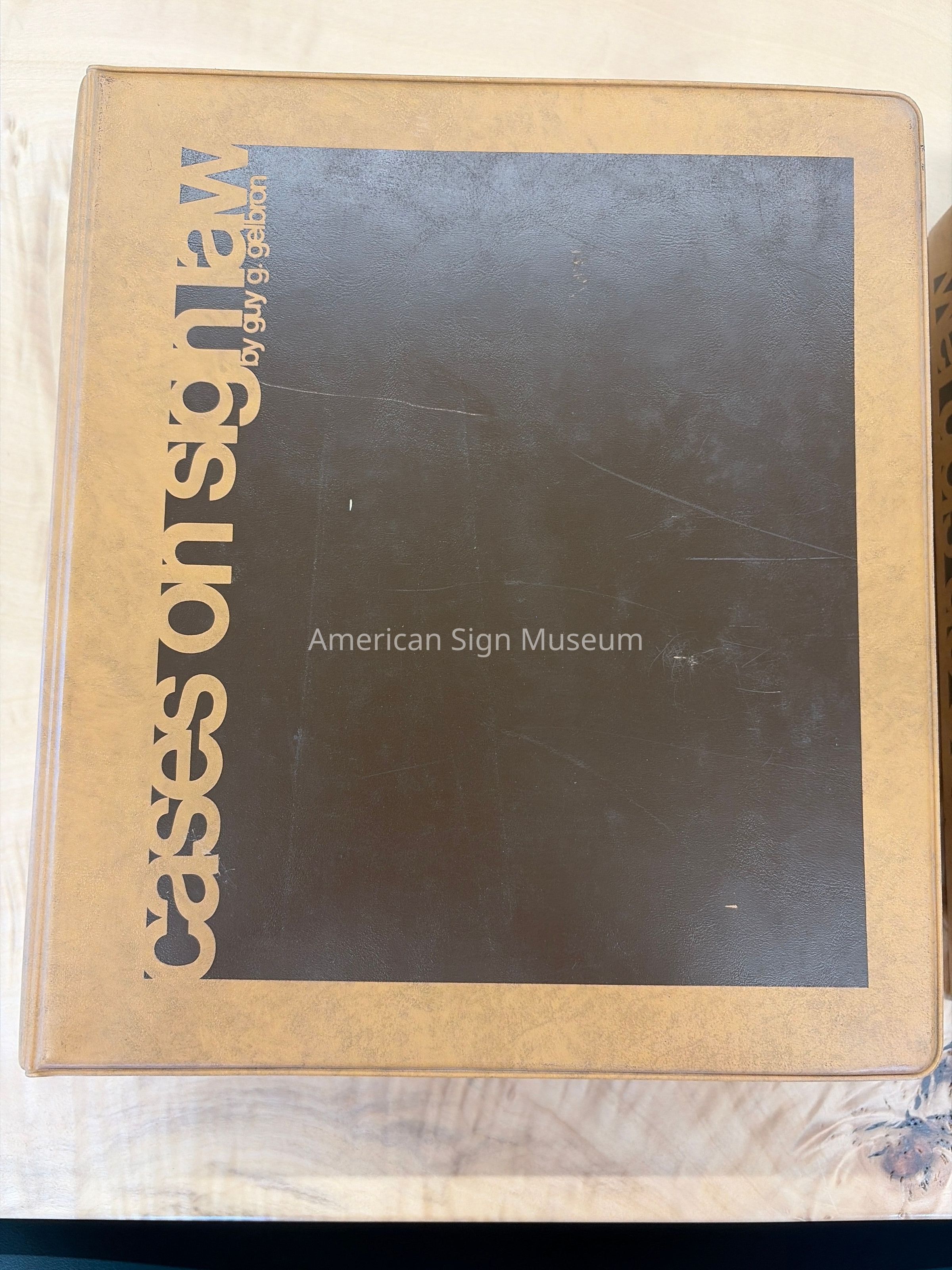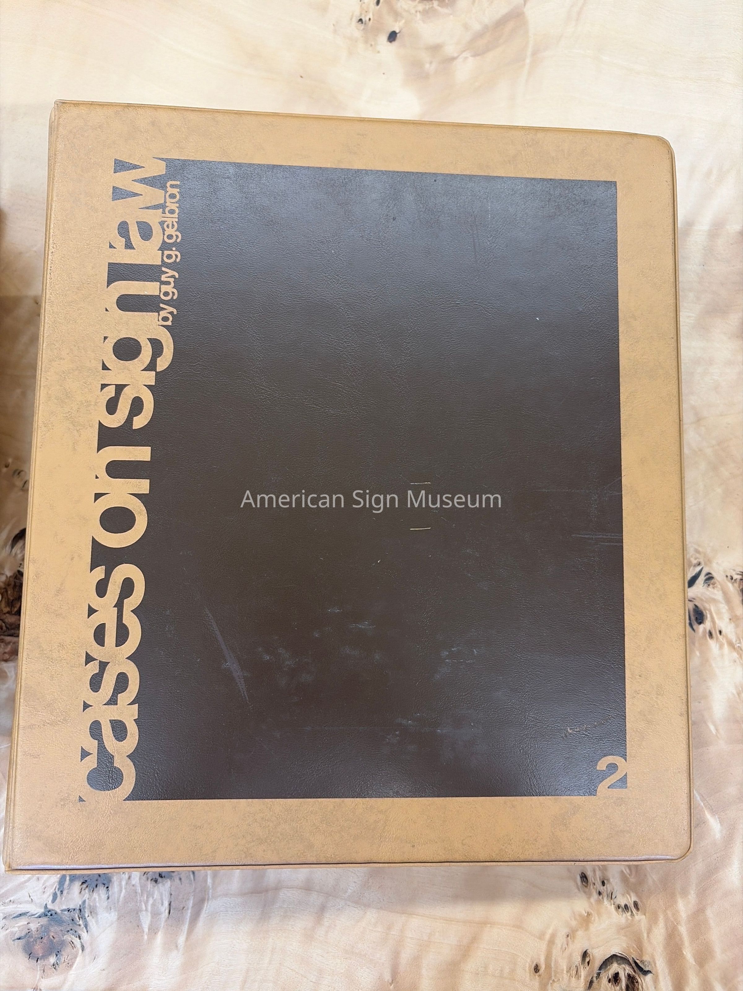 Two volume set of Cases on SIgn Law by Guy G. Gelbron and published by National Electric Sign Association; 1975.Summaries of sign law cases are indexed by state: Alabama - New York in Volume 1 and the balance in Volume 2, with an additional section of "Federal" and "Canada."Collection